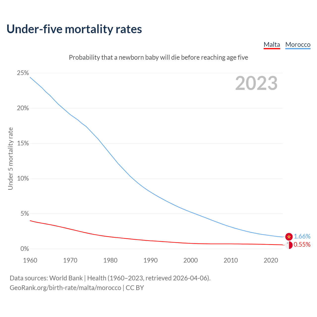The chance that a newborn baby will die before reaching age five is 0.55% in Malta and 1.66% in Morocco. Above is a chart with historical data on under-five mortality rates.