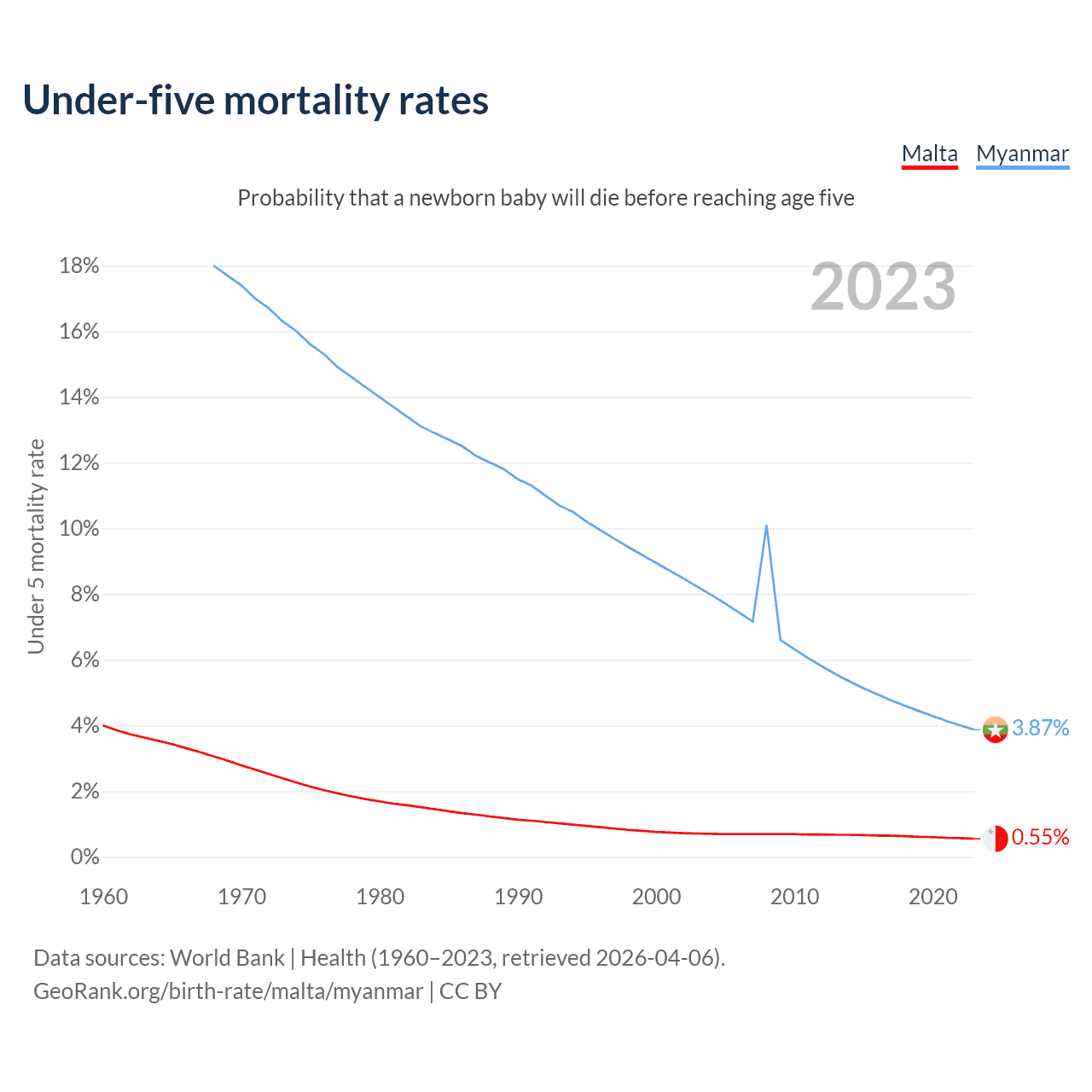 The chance that a newborn baby will die before reaching age five is 0.55% in Malta and 3.87% in Myanmar. Above is a chart with historical data on under-five mortality rates.