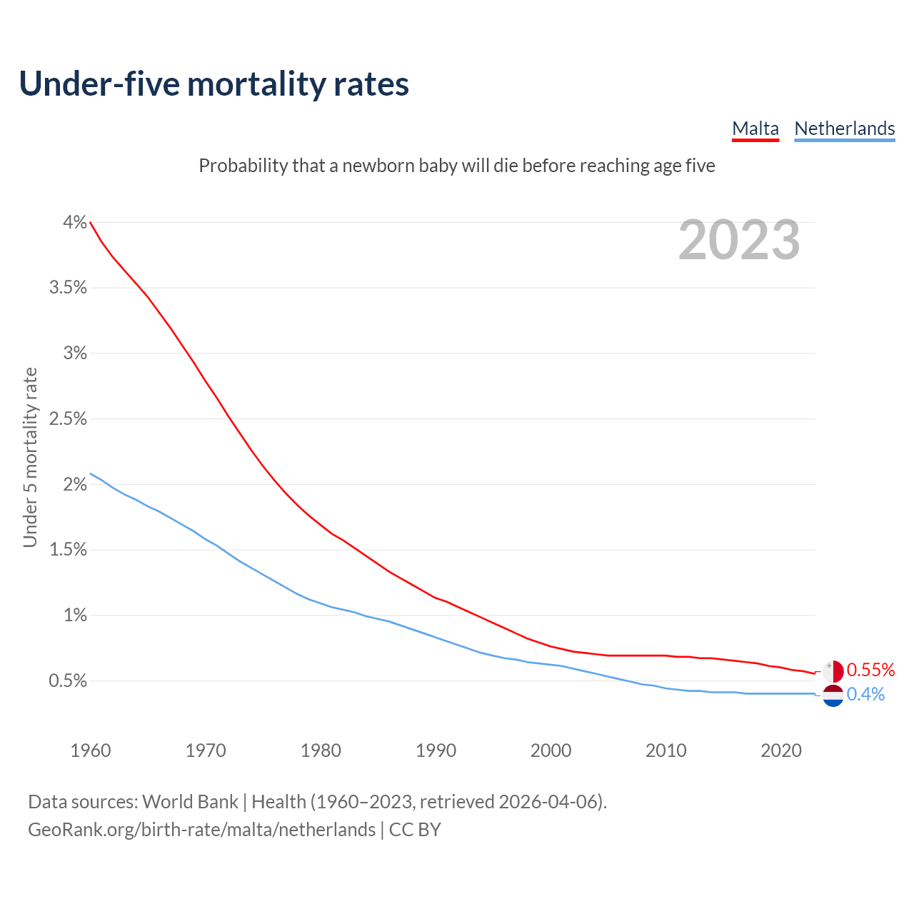 The chance that a newborn baby will die before reaching age five is 0.55% in Malta and 0.4% in the Netherlands. Above is a chart with historical data on under-five mortality rates.