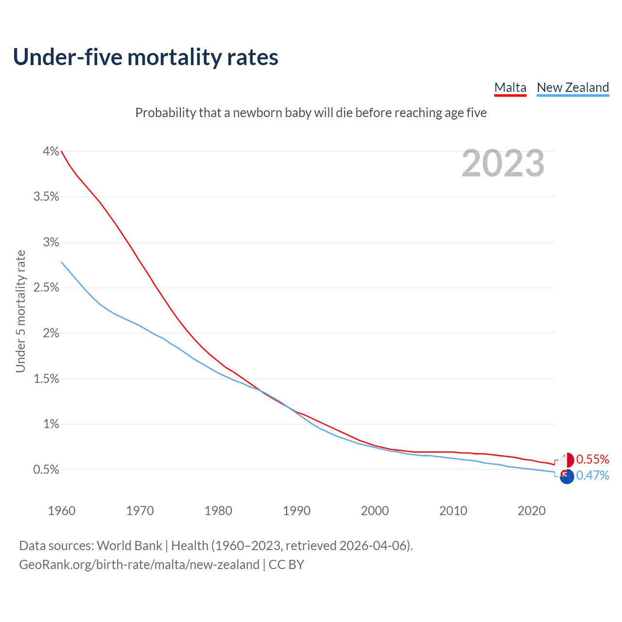 The chance that a newborn baby will die before reaching age five is 0.55% in Malta and 0.47% in New Zealand. Above is a chart with historical data on under-five mortality rates.