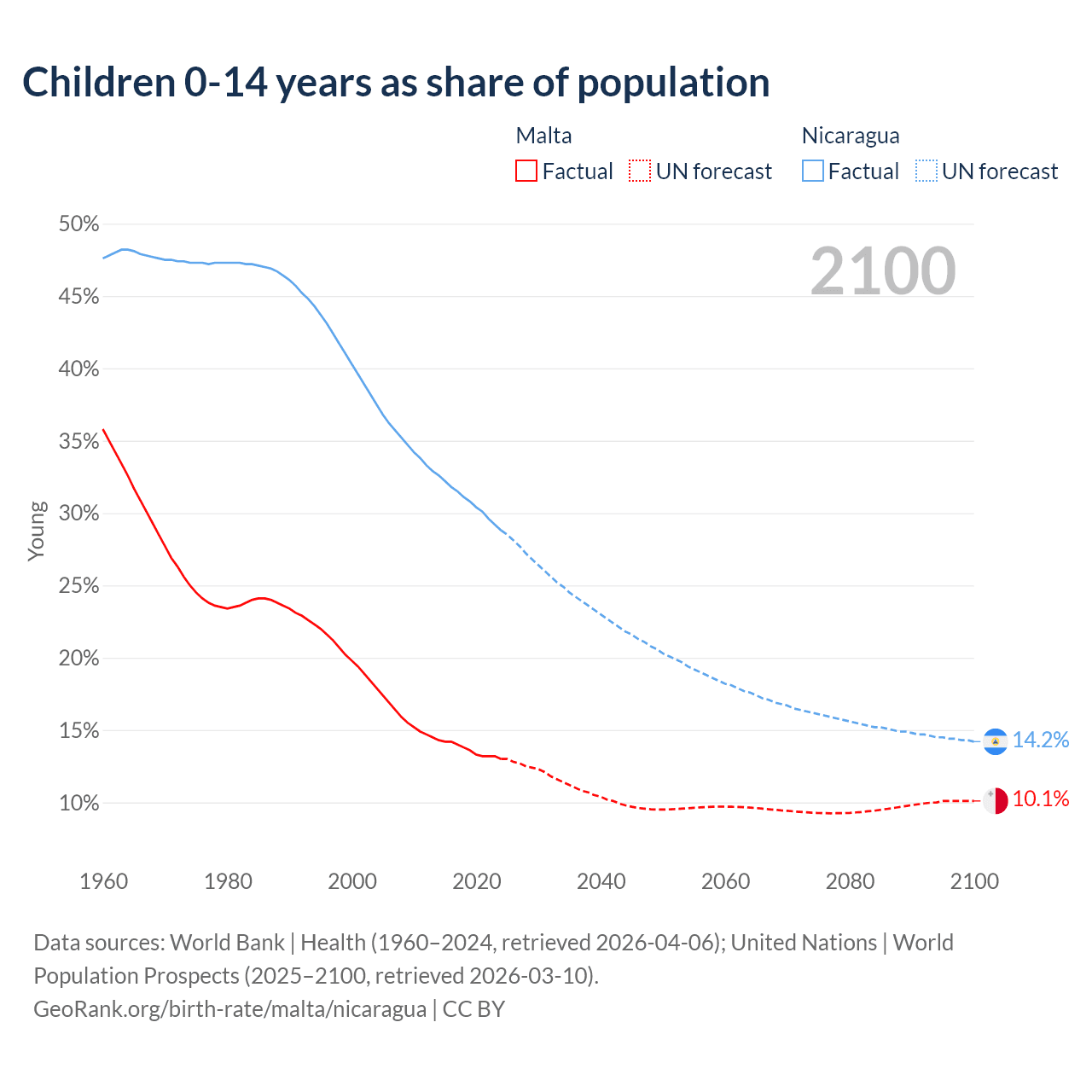 According to the latest available data on birth rates, the fertility rate in Malta was 1.06 children per woman in 2023, compared to 2.22 in Nicaragua in 2023. The replacement level is considered to be 2.1 children per woman.