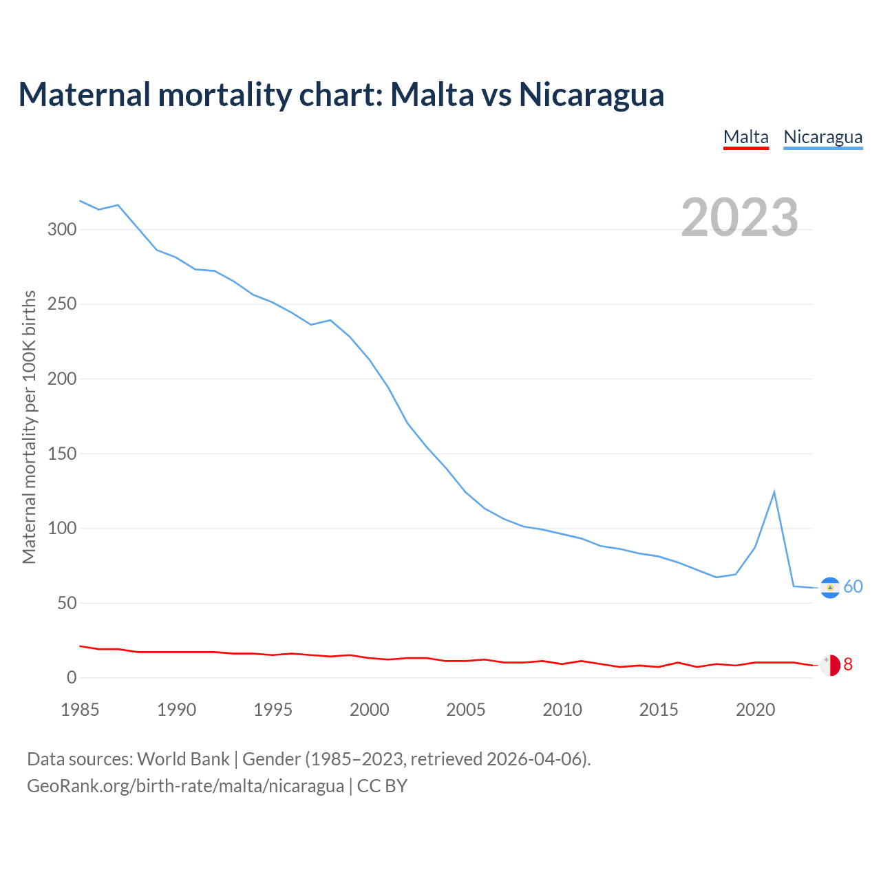 The maternal mortality rate, which is the probability of dying during childbirth or within 42 days of pregnancy termination, is 8 deaths per 100,000 live births in Malta, compared to 60 deaths in Nicaragua.