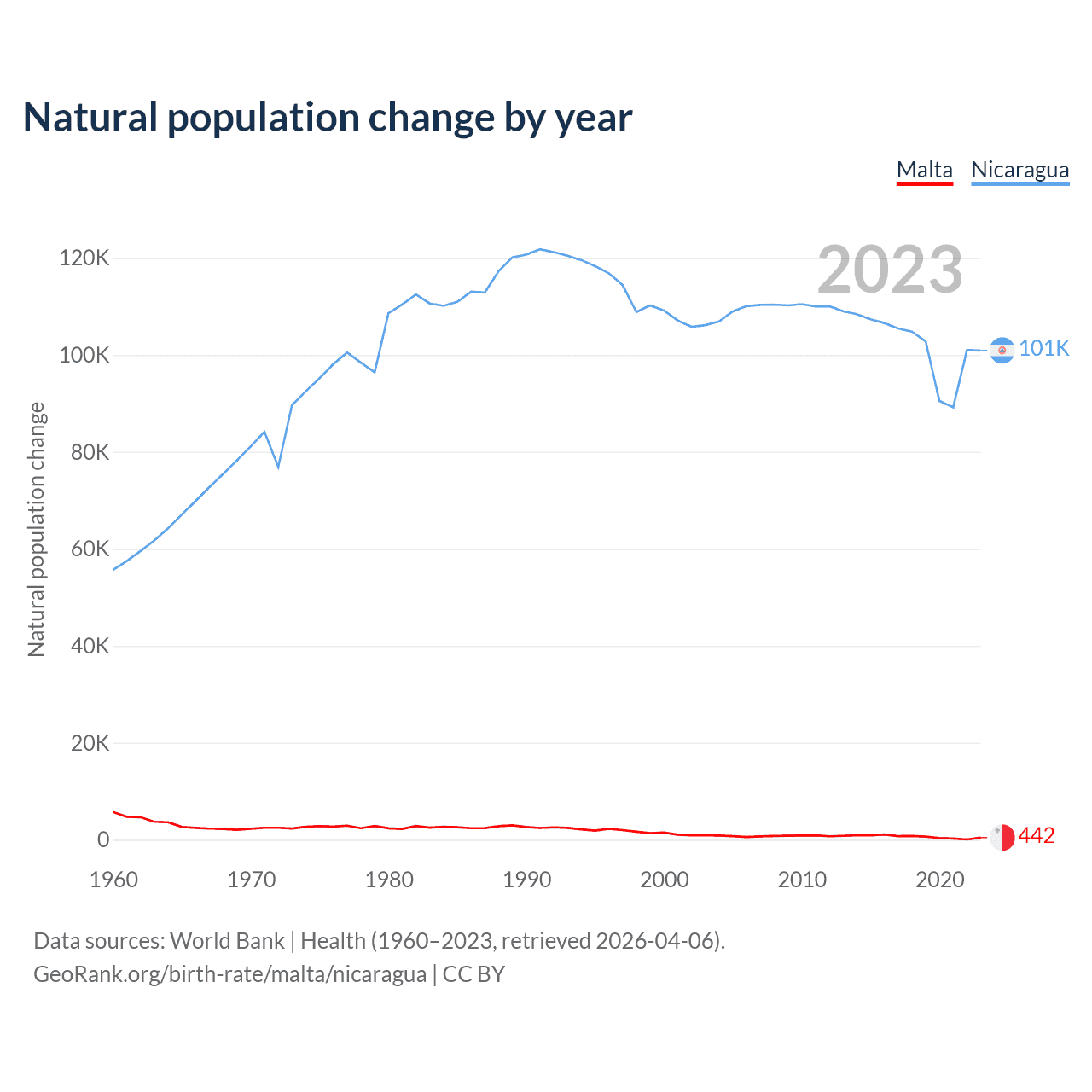 Malta has an annual birth rate of 8.1 births per 1,000 people, compared to 19.4 for Nicaragua. The average number of children a woman is expected to have during her lifetime — the fertility rate, is 1.06 in Malta and 2.22 in Nicaragua — 109.2% difference.