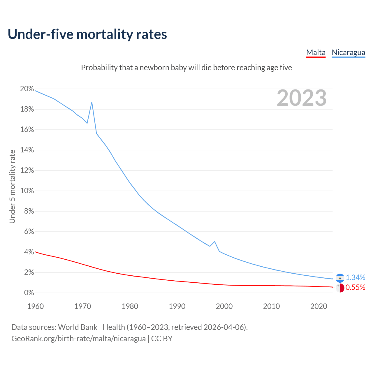 The chance that a newborn baby will die before reaching age five is 0.55% in Malta and 1.34% in Nicaragua. Above is a chart with historical data on under-five mortality rates.
