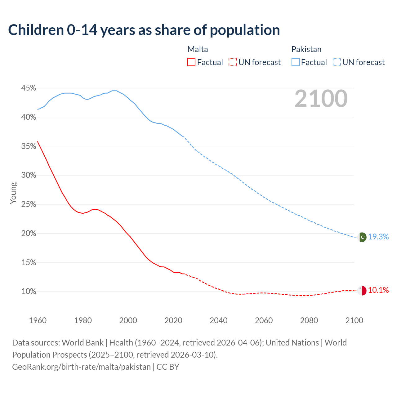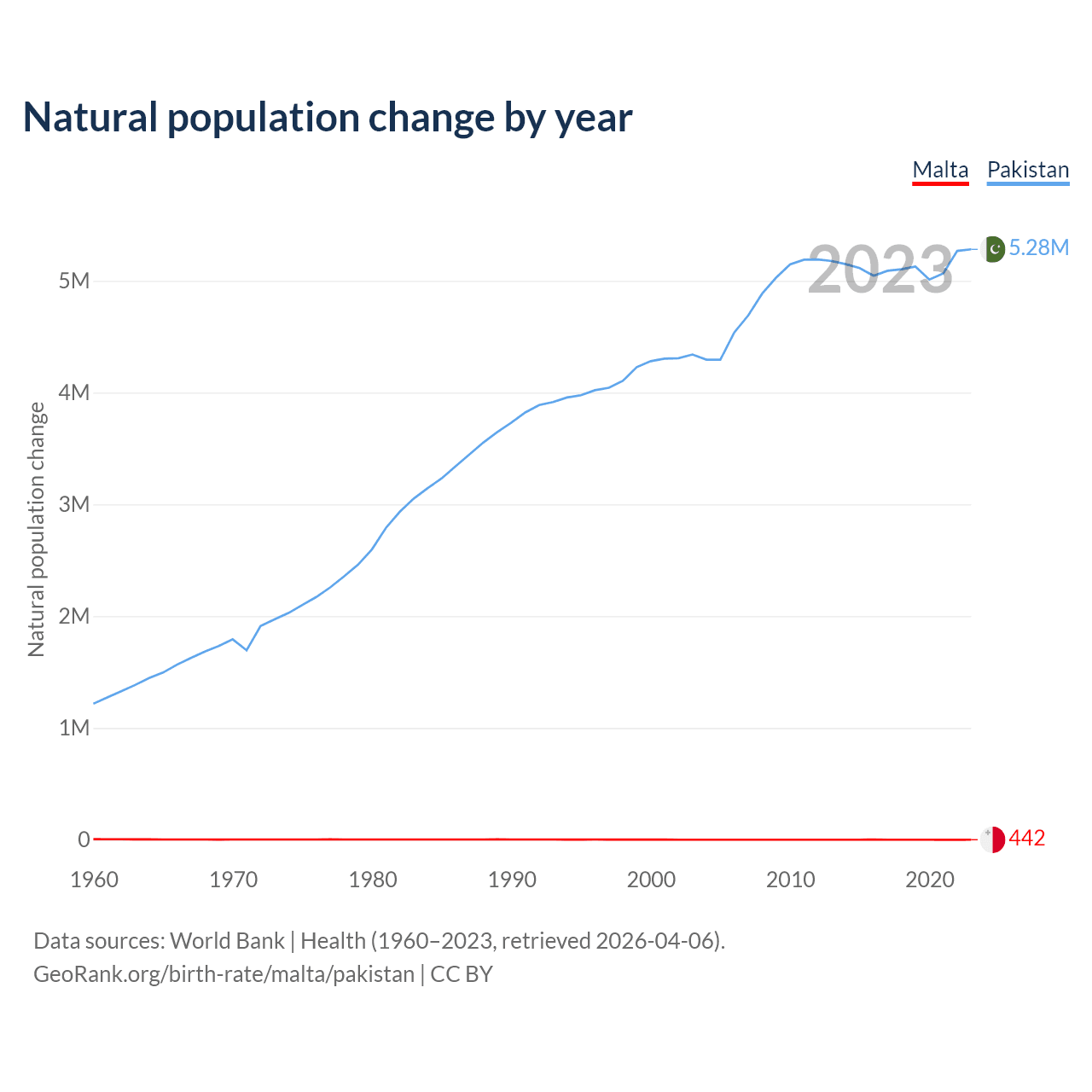 Malta has an annual birth rate of 8.1 births per 1,000 people, compared to 27.8 for Pakistan. The average number of children a woman is expected to have during her lifetime — the fertility rate, is 1.06 in Malta and 3.61 in Pakistan — 240.1% difference.