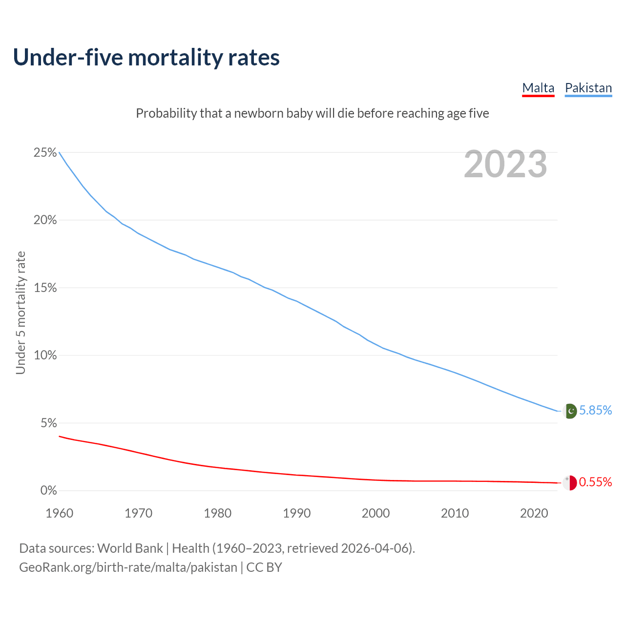 The chance that a newborn baby will die before reaching age five is 0.55% in Malta and 5.85% in Pakistan. Above is a chart with historical data on under-five mortality rates.