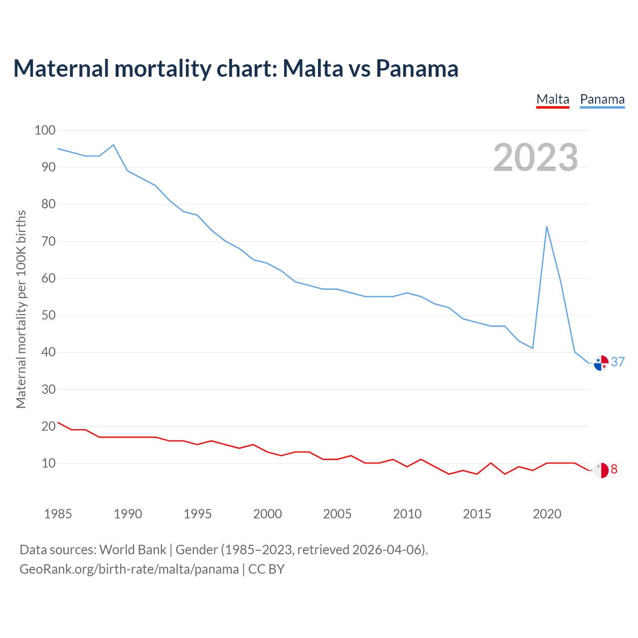 The maternal mortality rate, which is the probability of dying during childbirth or within 42 days of pregnancy termination, is 8 deaths per 100,000 live births in Malta, compared to 37 deaths in Panama.