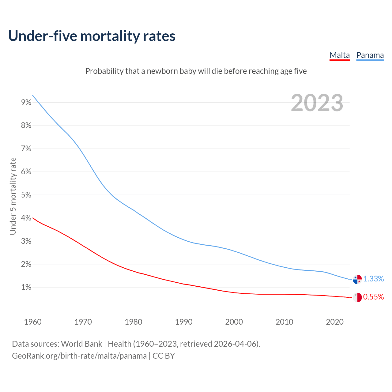 The chance that a newborn baby will die before reaching age five is 0.55% in Malta and 1.33% in Panama. Above is a chart with historical data on under-five mortality rates.