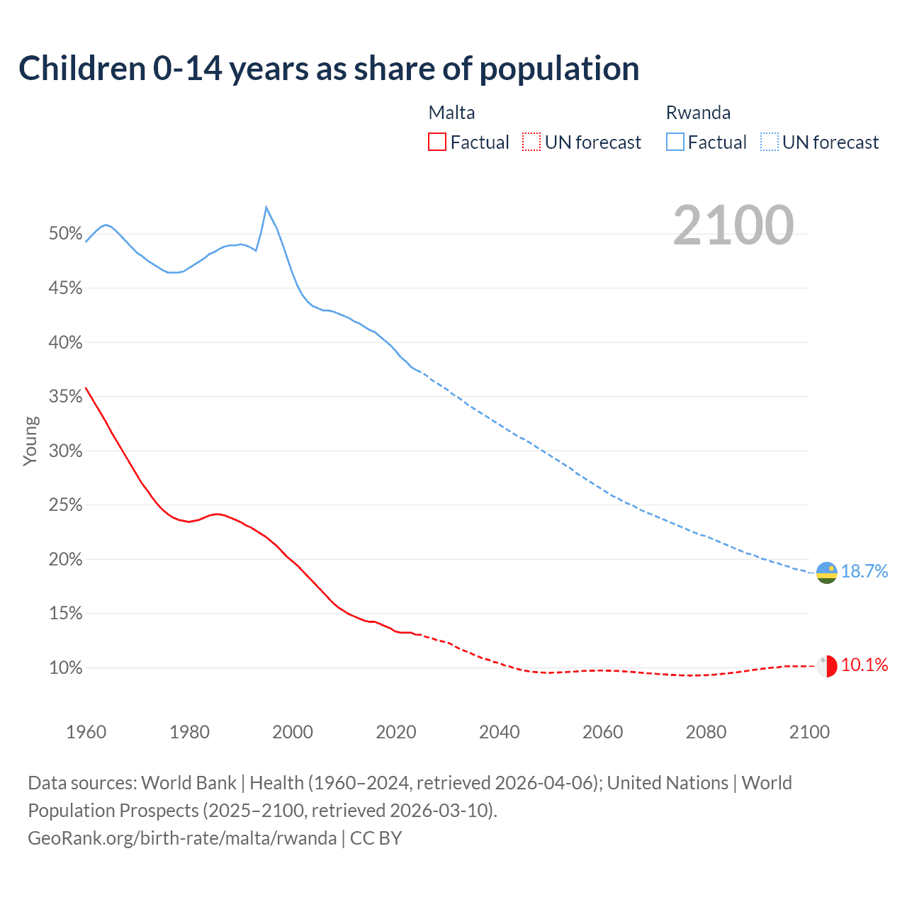 Malta has an annual birth rate of 8.1 births per 1,000 people, compared to 28.3 for Rwanda. The average number of children a woman is expected to have during her lifetime — the fertility rate, is 1.06 in Malta and 3.7 in Rwanda — 248.9% difference.