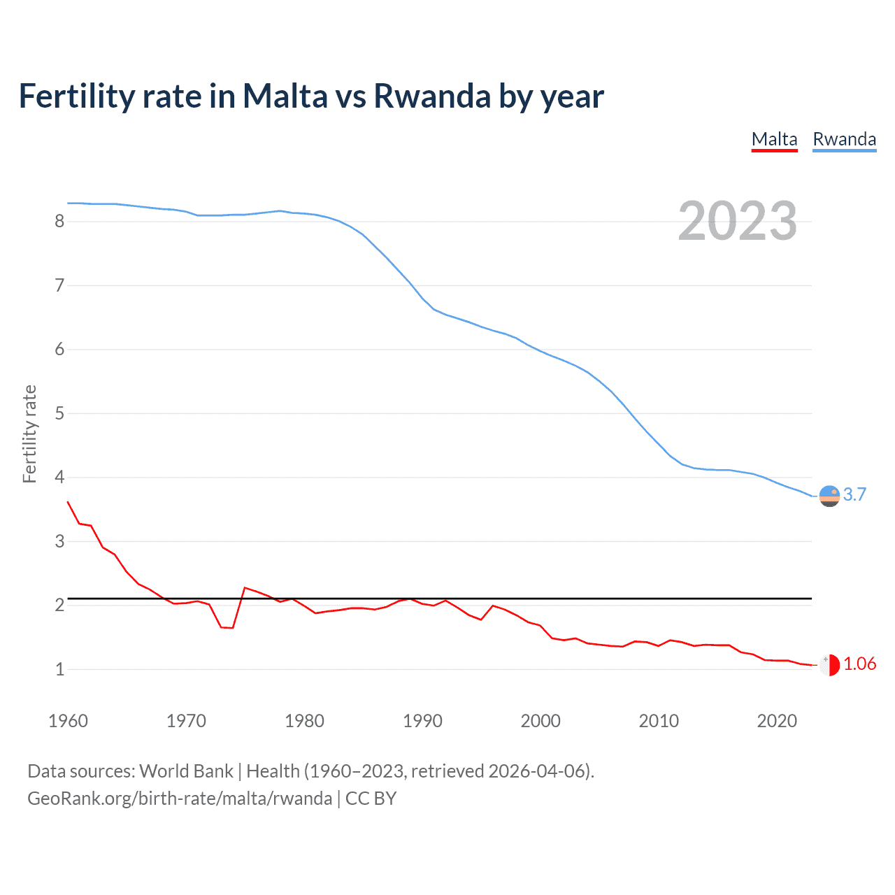 According to the latest available data on birth rates, the fertility rate in Malta was 1.06 children per woman in 2023, compared to 3.7 in Rwanda in 2023. The replacement level is considered to be 2.1 children per woman.