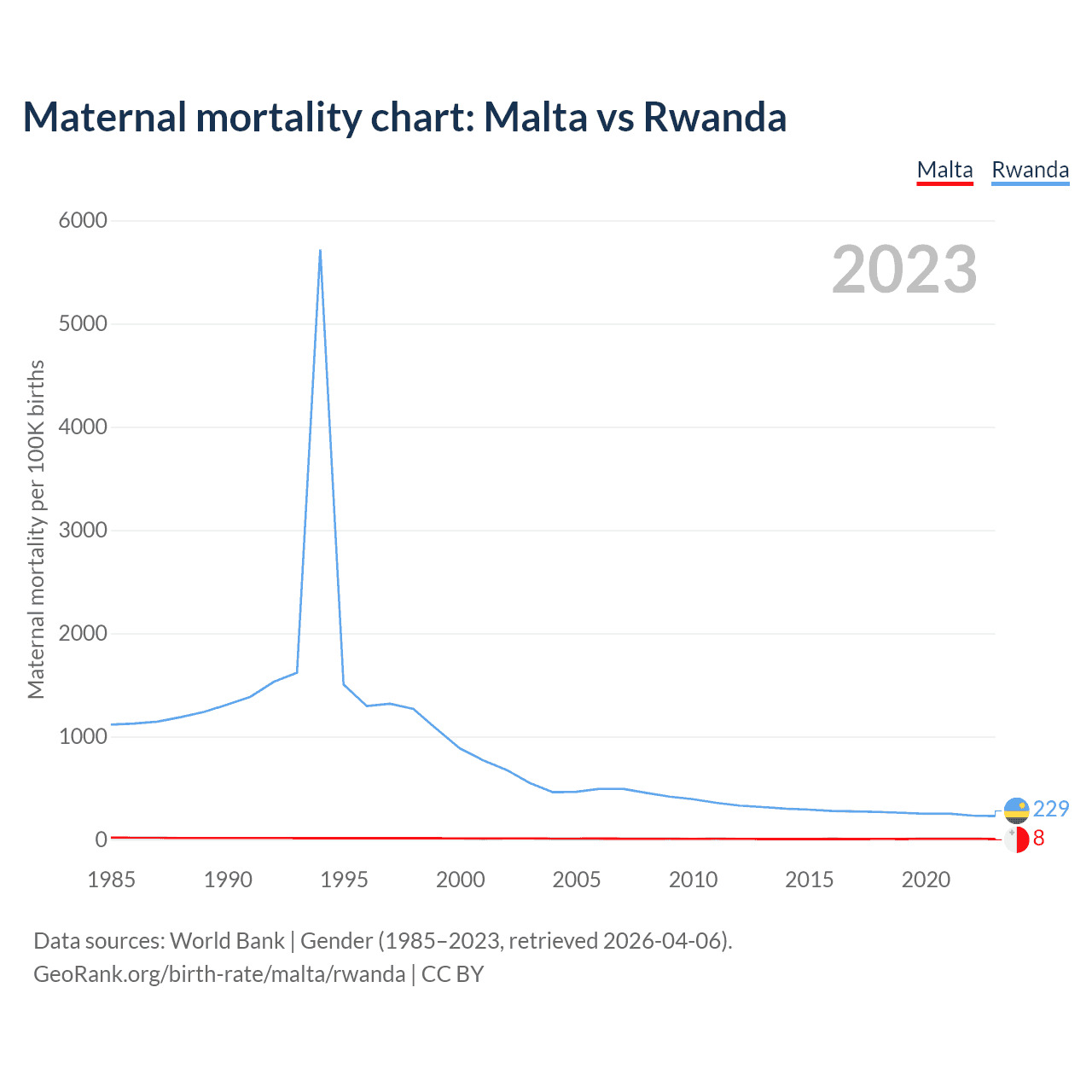 The maternal mortality rate, which is the probability of dying during childbirth or within 42 days of pregnancy termination, is 8 deaths per 100,000 live births in Malta, compared to 229 deaths in Rwanda.