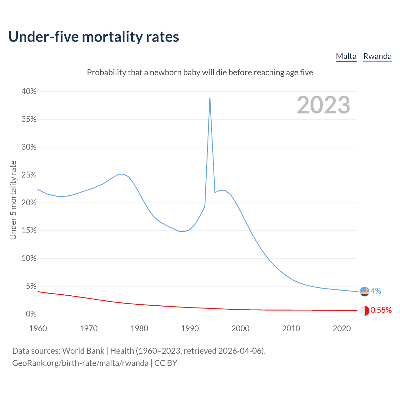 The chance that a newborn baby will die before reaching age five is 0.55% in Malta and 4% in Rwanda. Above is a chart with historical data on under-five mortality rates.