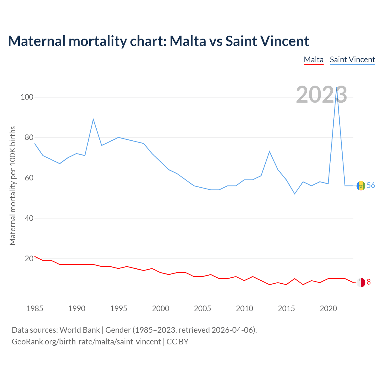 The maternal mortality rate, which is the probability of dying during childbirth or within 42 days of pregnancy termination, is 8 deaths per 100,000 live births in Malta, compared to 56 deaths in Saint Vincent.