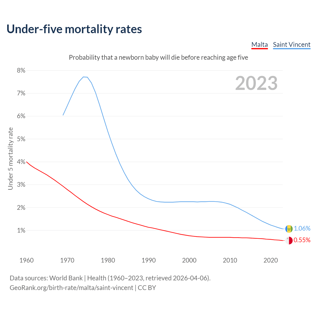The chance that a newborn baby will die before reaching age five is 0.55% in Malta and 1.06% in Saint Vincent. Above is a chart with historical data on under-five mortality rates.