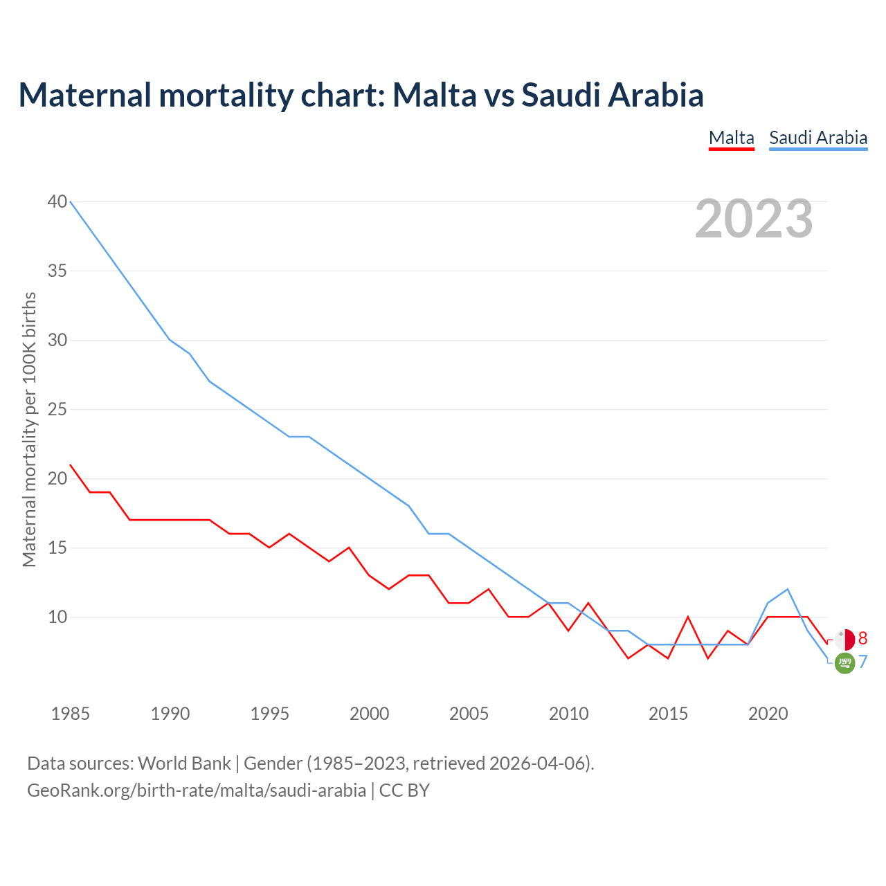 The maternal mortality rate, which is the probability of dying during childbirth or within 42 days of pregnancy termination, is 8 deaths per 100,000 live births in Malta, compared to 7 deaths in Saudi Arabia.