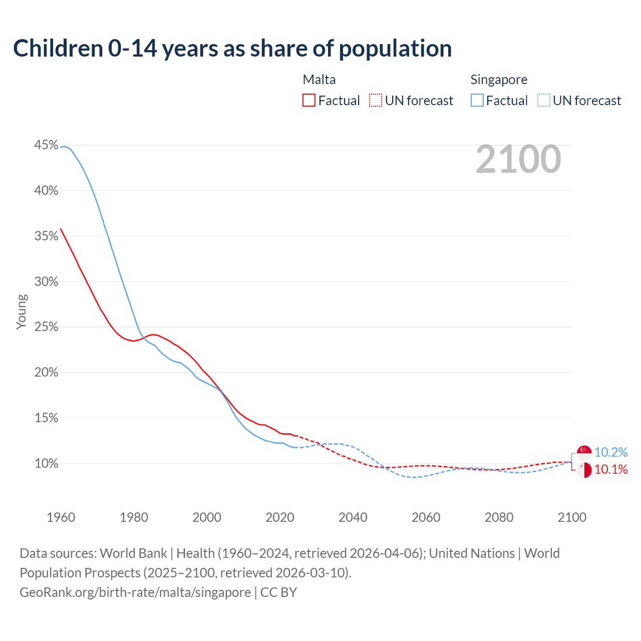 According to the latest available data on birth rates, the fertility rate in Malta was 1.06 children per woman in 2023, compared to 0.97 in Singapore in 2023. The replacement level is considered to be 2.1 children per woman.