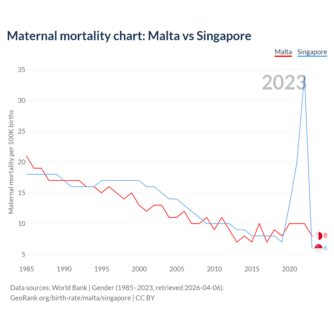 The maternal mortality rate, which is the probability of dying during childbirth or within 42 days of pregnancy termination, is 8 deaths per 100,000 live births in Malta, compared to 6 deaths in Singapore.
