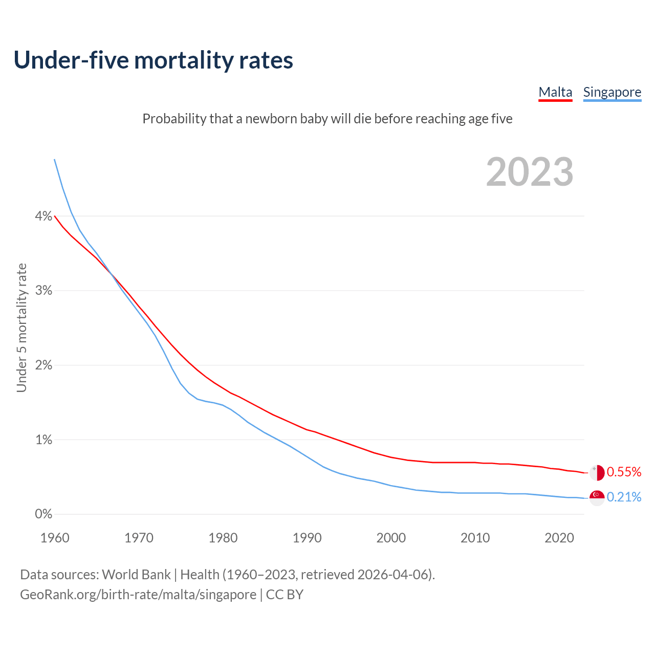The chance that a newborn baby will die before reaching age five is 0.55% in Malta and 0.21% in Singapore. Above is a chart with historical data on under-five mortality rates.