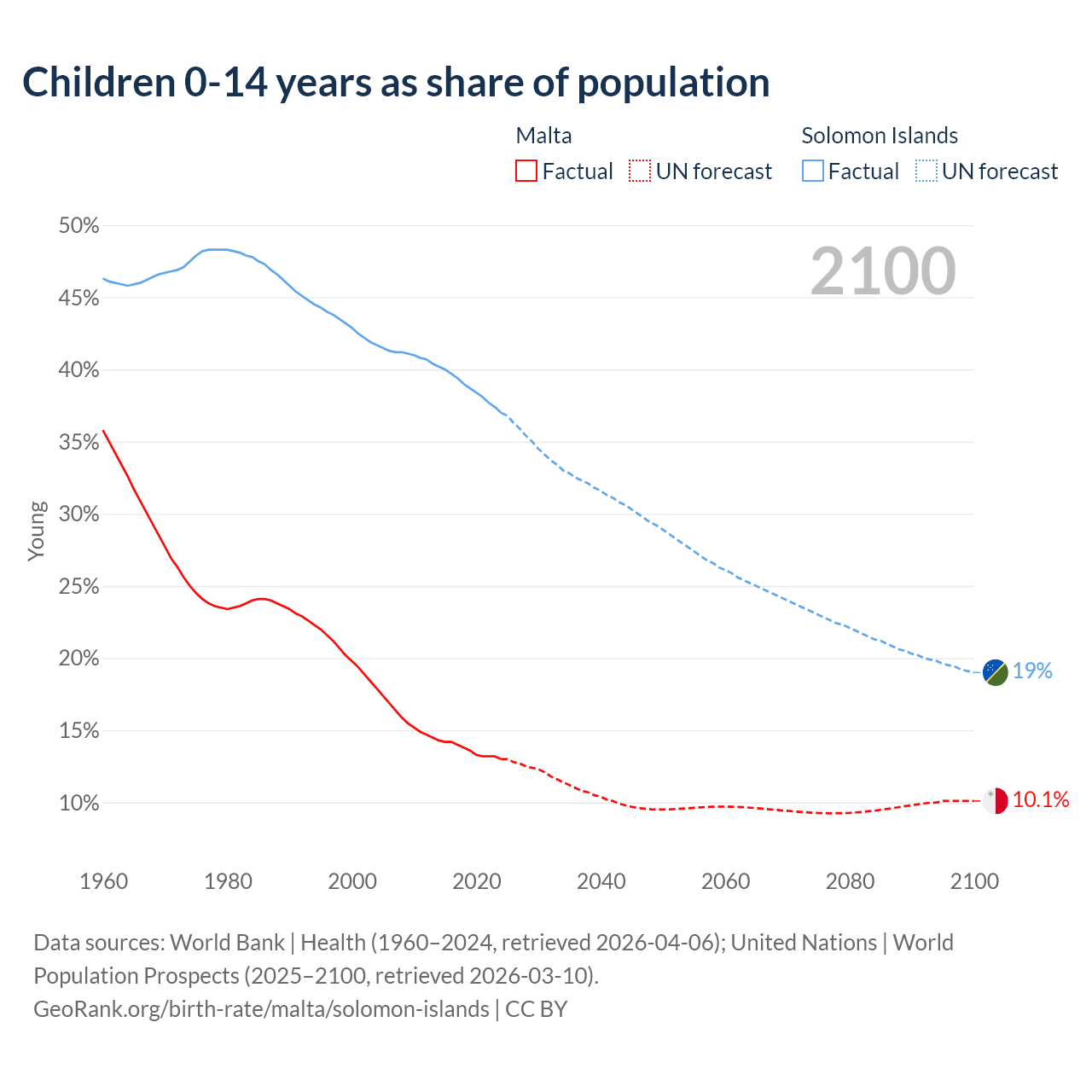 Malta has an annual birth rate of 8.1 births per 1,000 people, compared to 26.9 for the Solomon Islands. The average number of children a woman is expected to have during her lifetime — the fertility rate, is 1.06 in Malta and 3.56 in the Solomon Islands — 235.6% difference.