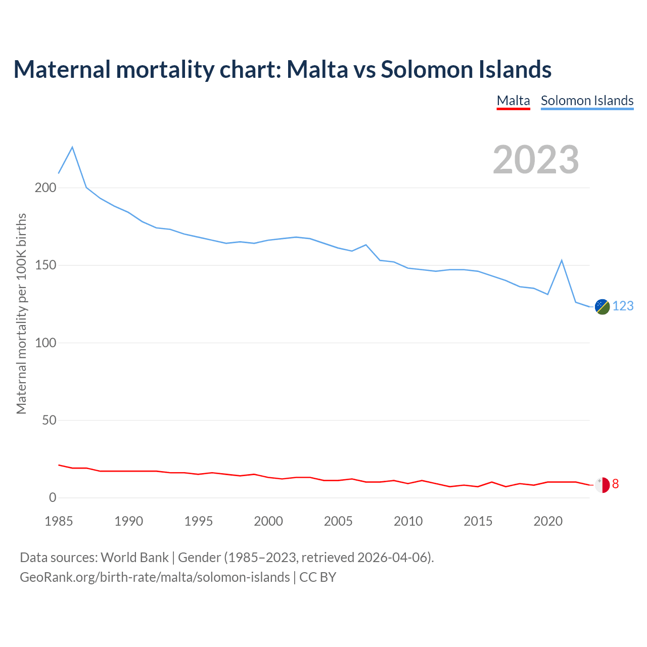 The maternal mortality rate, which is the probability of dying during childbirth or within 42 days of pregnancy termination, is 8 deaths per 100,000 live births in Malta, compared to 123 deaths in the Solomon Islands.