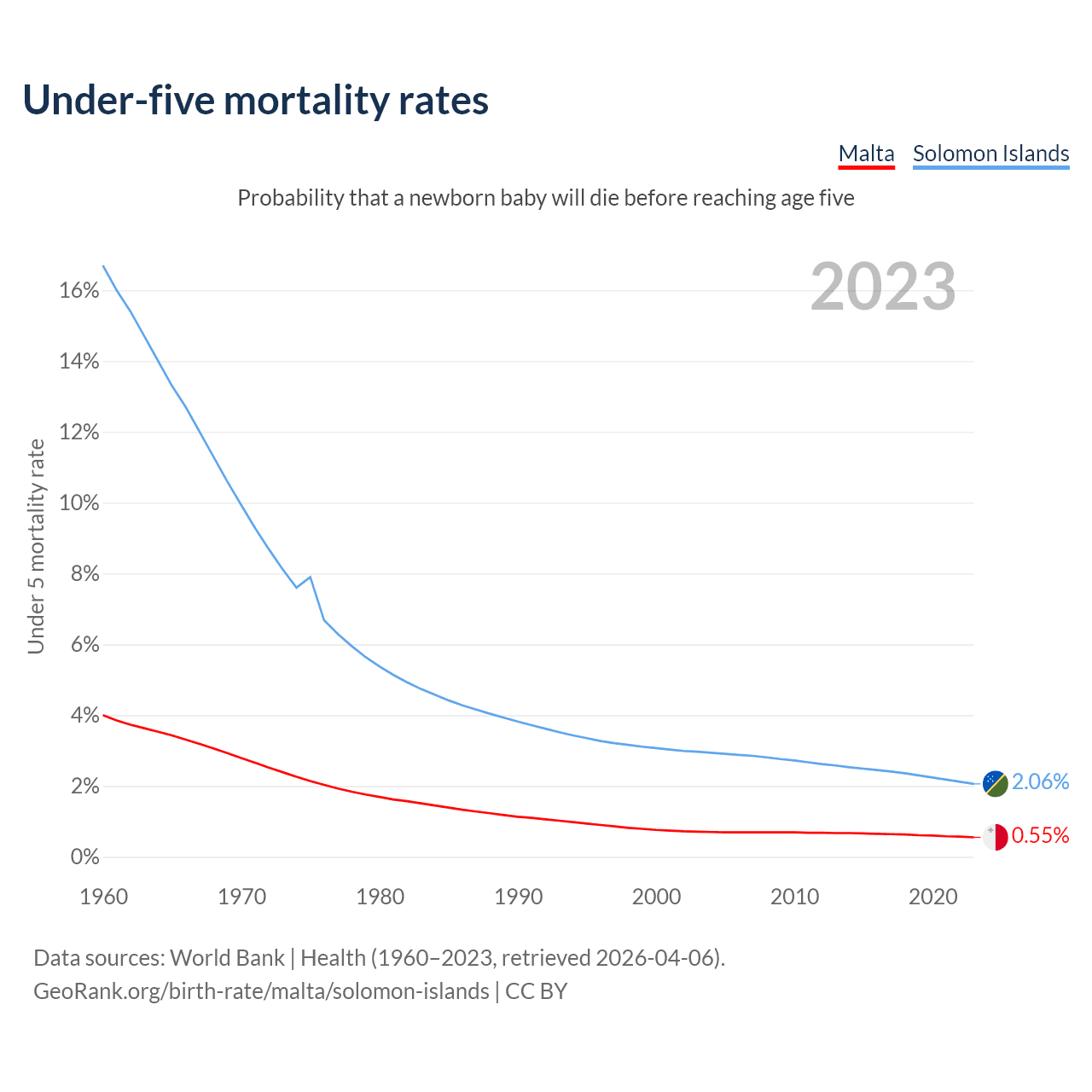 The chance that a newborn baby will die before reaching age five is 0.55% in Malta and 2.06% in the Solomon Islands. Above is a chart with historical data on under-five mortality rates.