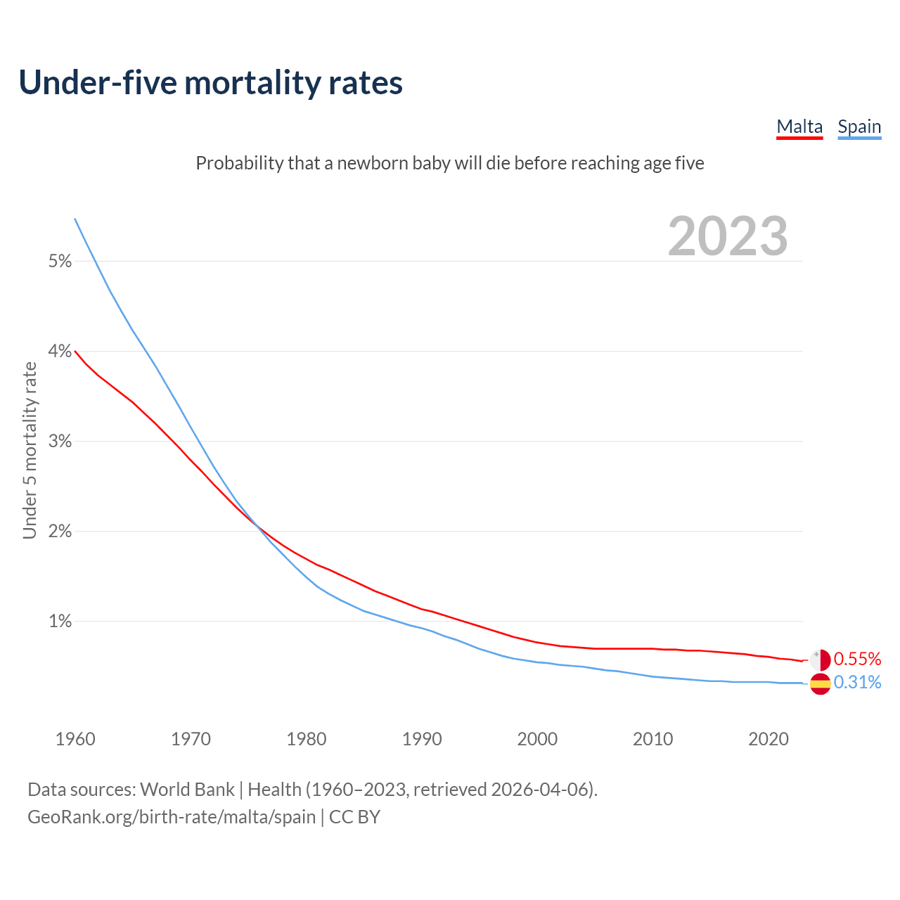 The chance that a newborn baby will die before reaching age five is 0.55% in Malta and 0.31% in Spain. Above is a chart with historical data on under-five mortality rates.