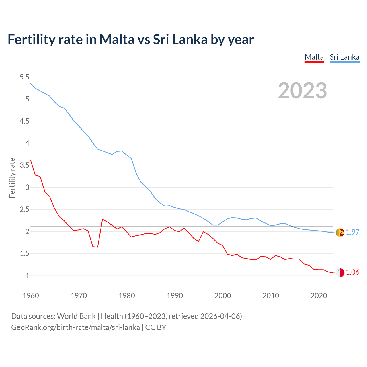 According to the latest available data on birth rates, the fertility rate in Malta was 1.06 children per woman in 2023, compared to 1.97 in Sri Lanka in 2023. The replacement level is considered to be 2.1 children per woman.