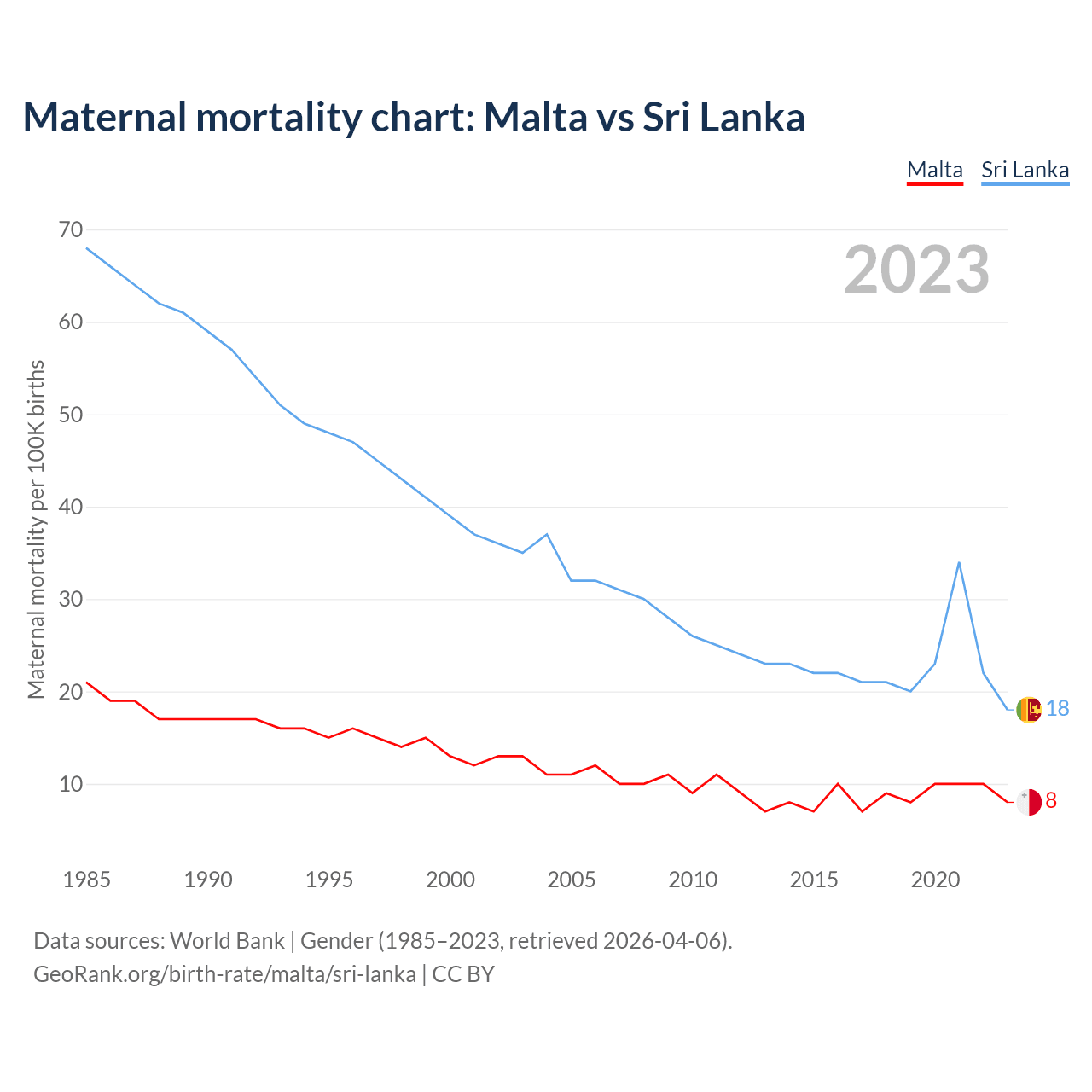 The maternal mortality rate, which is the probability of dying during childbirth or within 42 days of pregnancy termination, is 8 deaths per 100,000 live births in Malta, compared to 18 deaths in Sri Lanka.