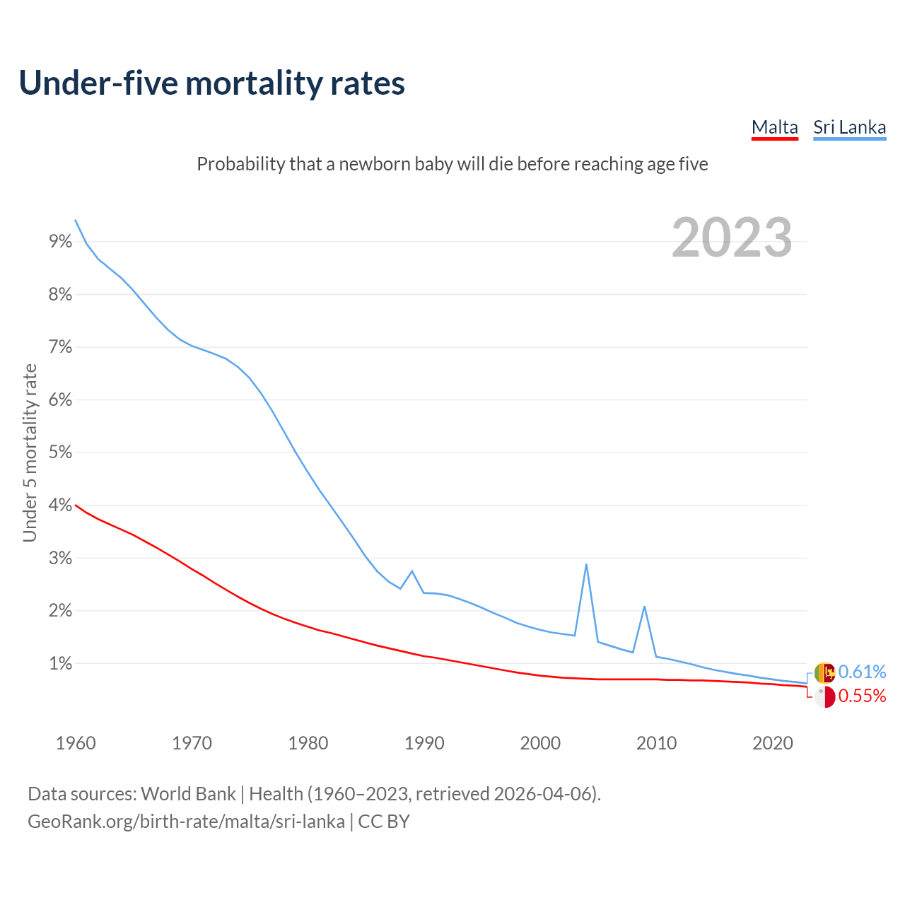 The chance that a newborn baby will die before reaching age five is 0.55% in Malta and 0.61% in Sri Lanka. Above is a chart with historical data on under-five mortality rates.