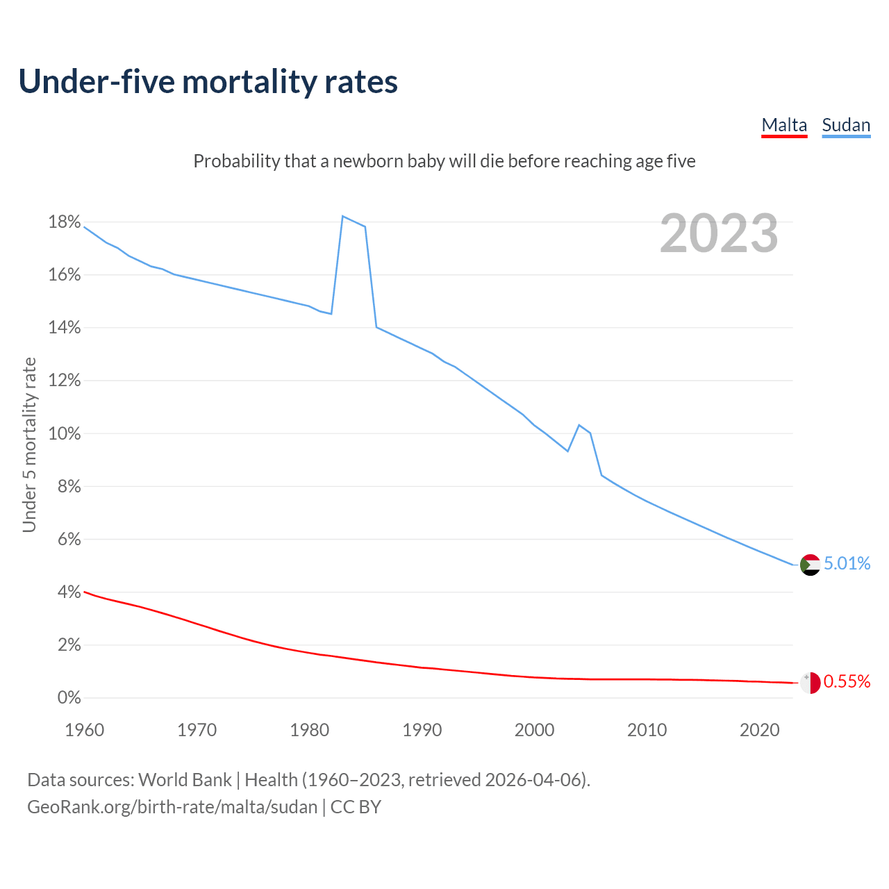The chance that a newborn baby will die before reaching age five is 0.55% in Malta and 5.01% in Sudan. Above is a chart with historical data on under-five mortality rates.