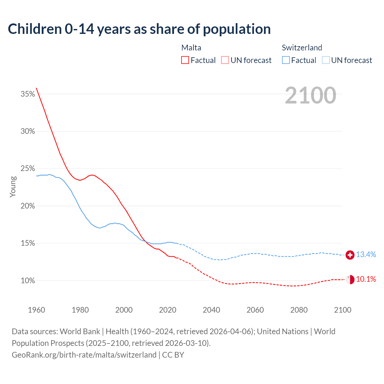 According to the latest available data on birth rates, the fertility rate in Malta was 1.06 children per woman in 2023, compared to 1.33 in Switzerland in 2023. The replacement level is considered to be 2.1 children per woman.