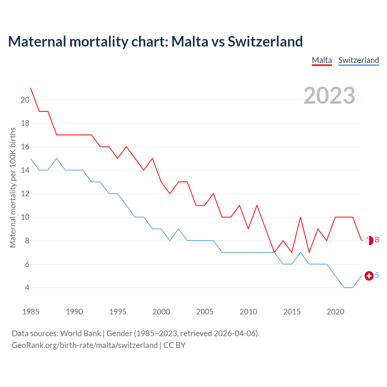 The maternal mortality rate, which is the probability of dying during childbirth or within 42 days of pregnancy termination, is 8 deaths per 100,000 live births in Malta, compared to 5 deaths in Switzerland.