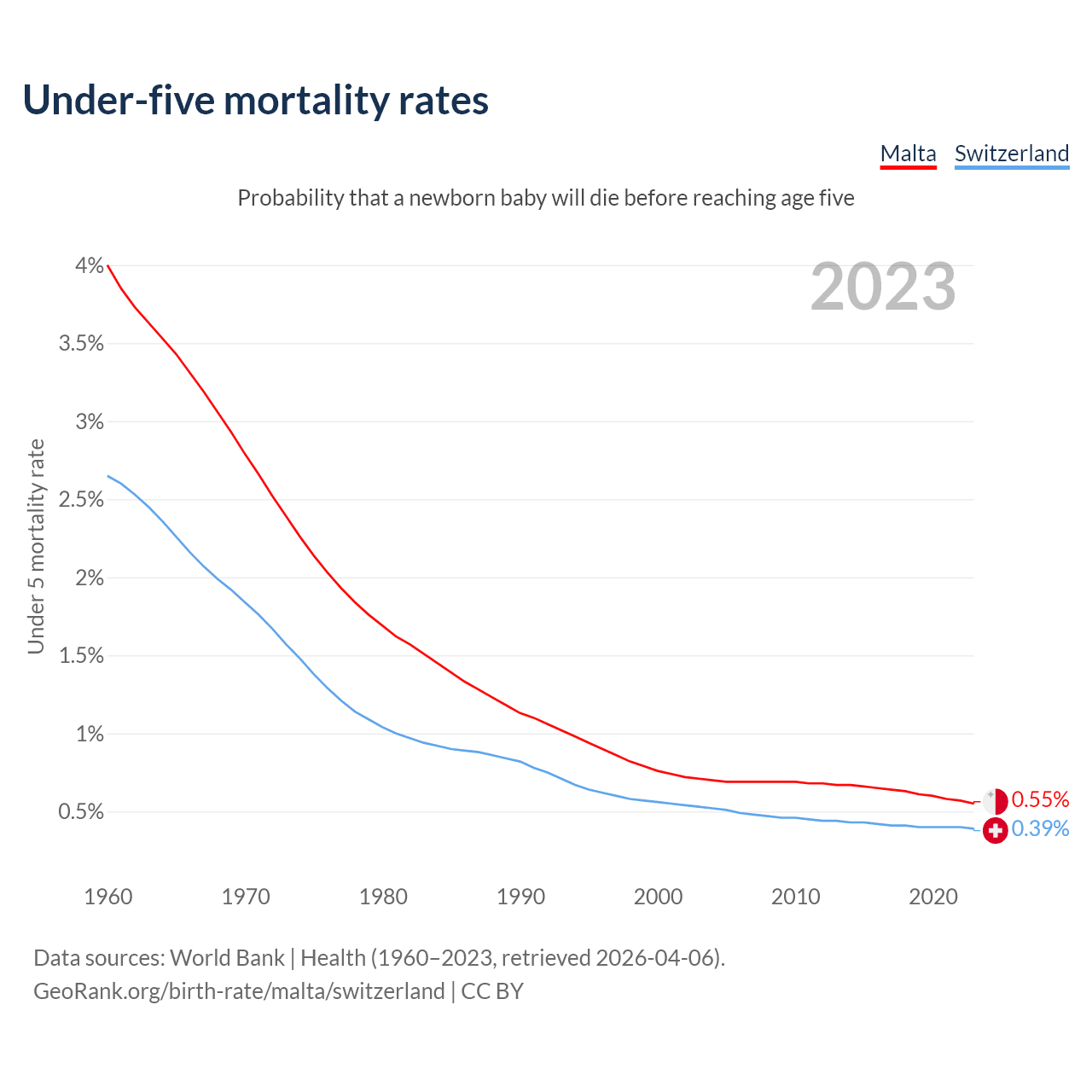 The chance that a newborn baby will die before reaching age five is 0.55% in Malta and 0.39% in Switzerland. Above is a chart with historical data on under-five mortality rates.