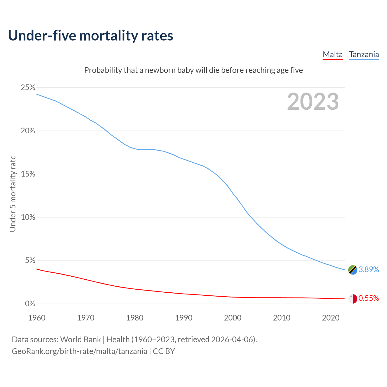The chance that a newborn baby will die before reaching age five is 0.55% in Malta and 3.89% in Tanzania. Above is a chart with historical data on under-five mortality rates.