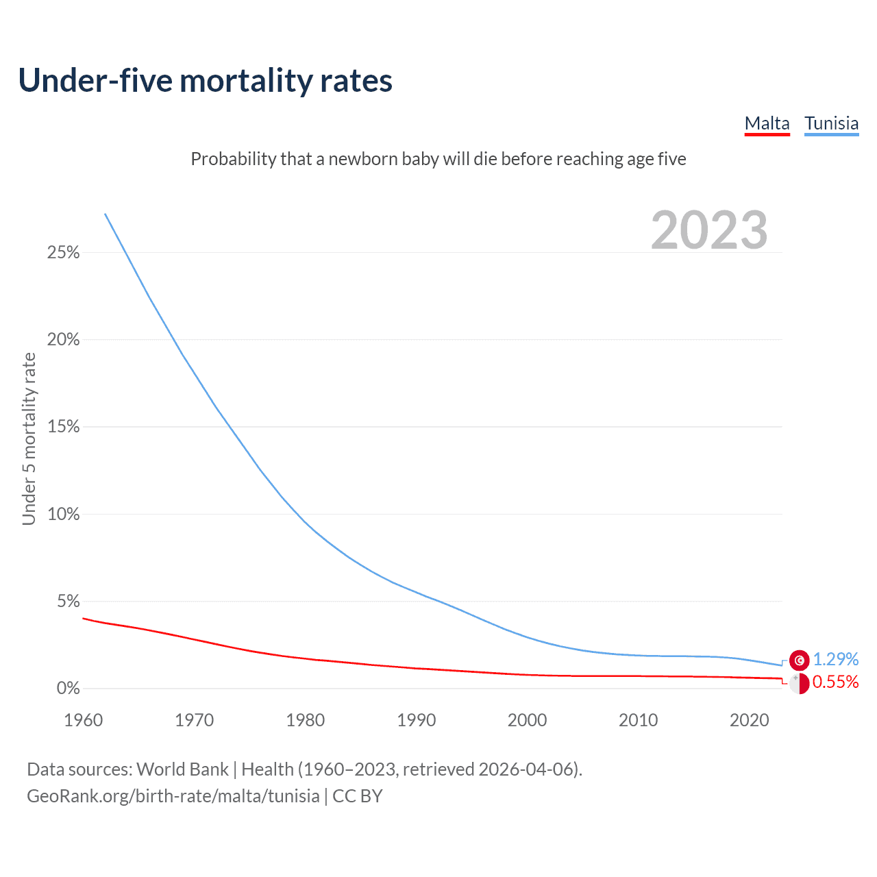 The chance that a newborn baby will die before reaching age five is 0.55% in Malta and 1.29% in Tunisia. Above is a chart with historical data on under-five mortality rates.