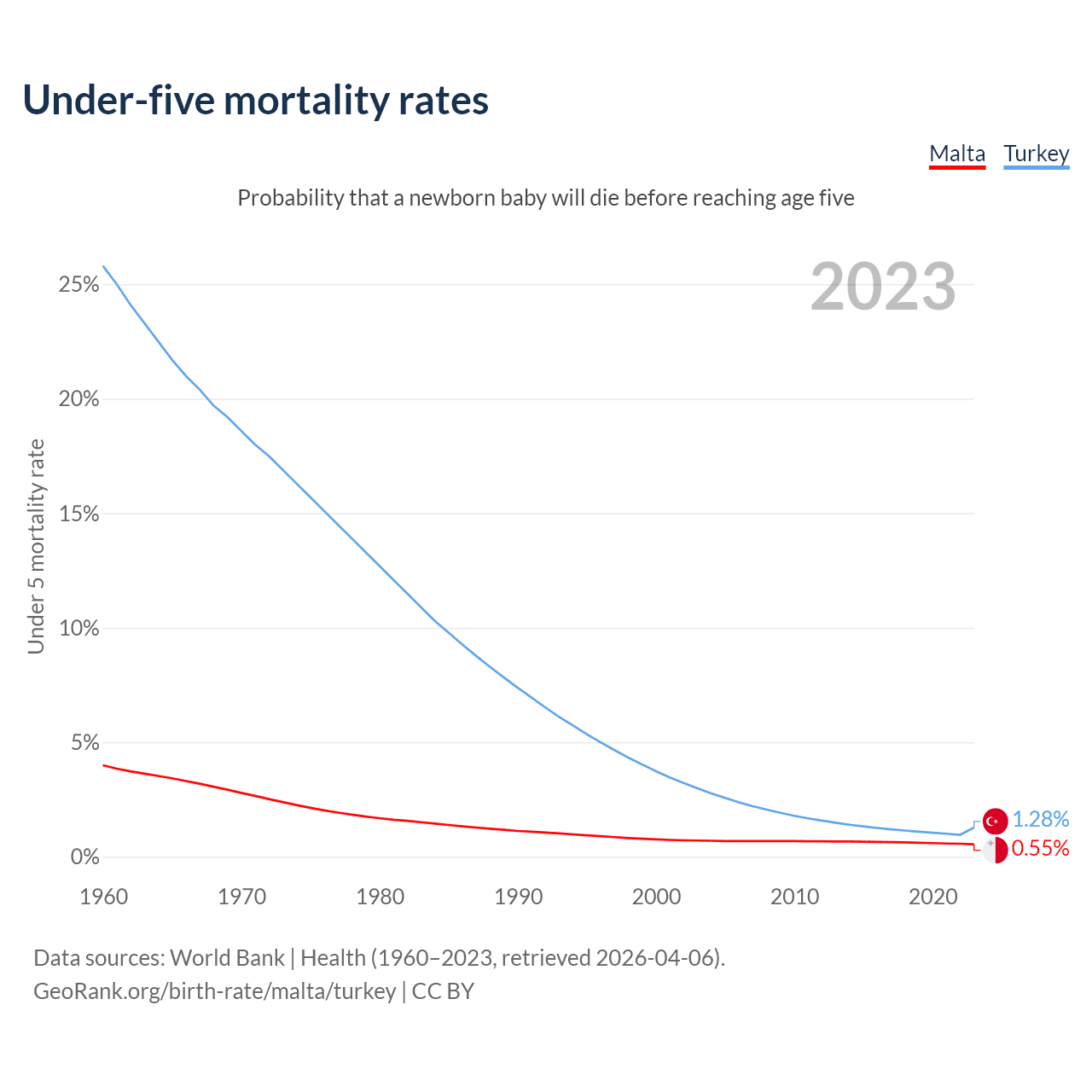 The chance that a newborn baby will die before reaching age five is 0.55% in Malta and 1.28% in Turkey. Above is a chart with historical data on under-five mortality rates.