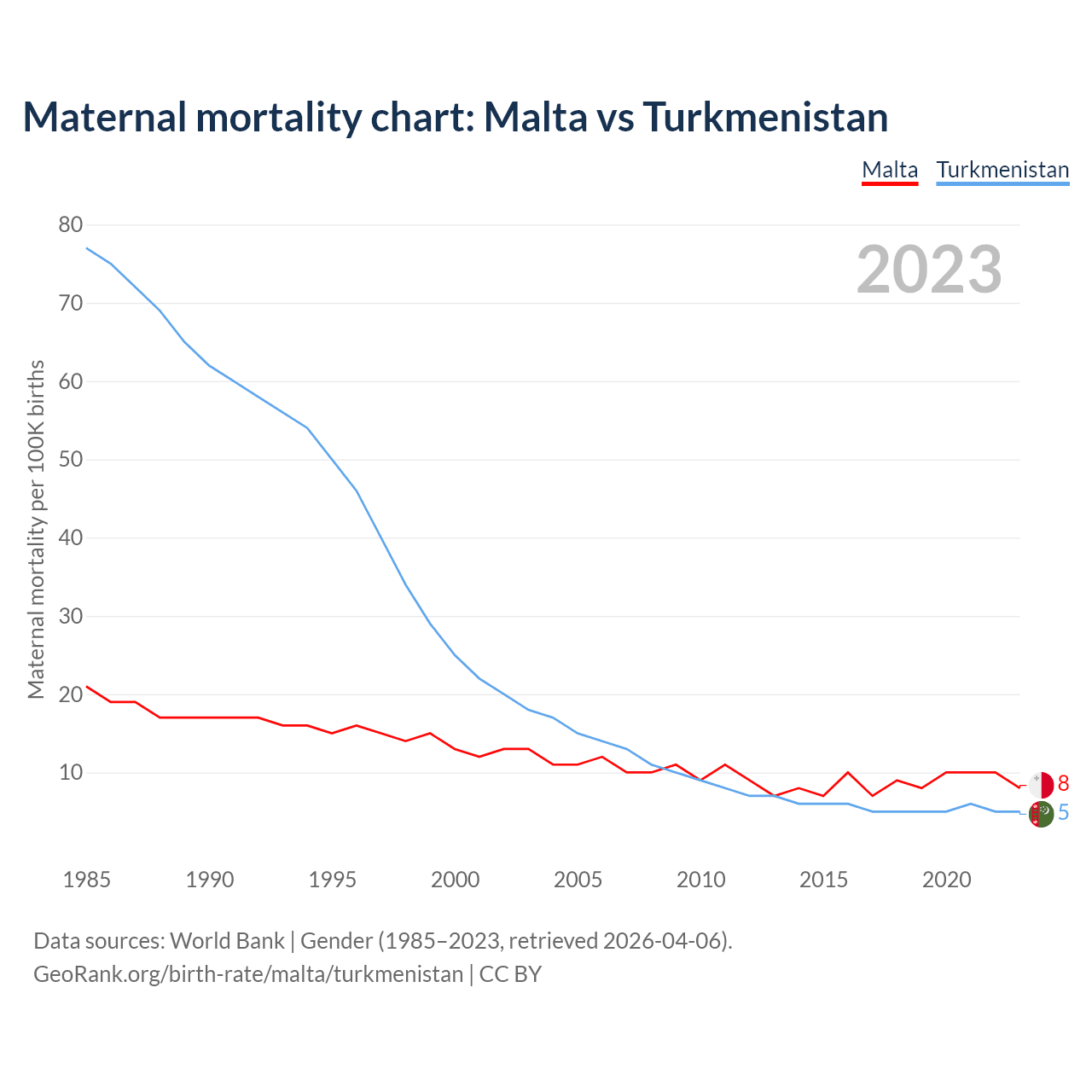The maternal mortality rate, which is the probability of dying during childbirth or within 42 days of pregnancy termination, is 8 deaths per 100,000 live births in Malta, compared to 5 deaths in Turkmenistan.