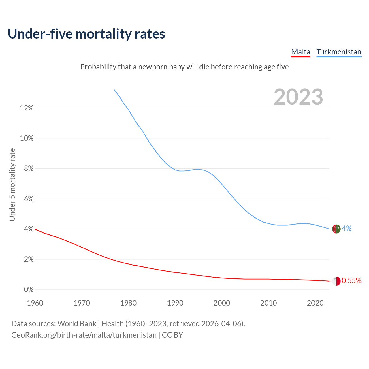 The chance that a newborn baby will die before reaching age five is 0.55% in Malta and 4% in Turkmenistan. Above is a chart with historical data on under-five mortality rates.