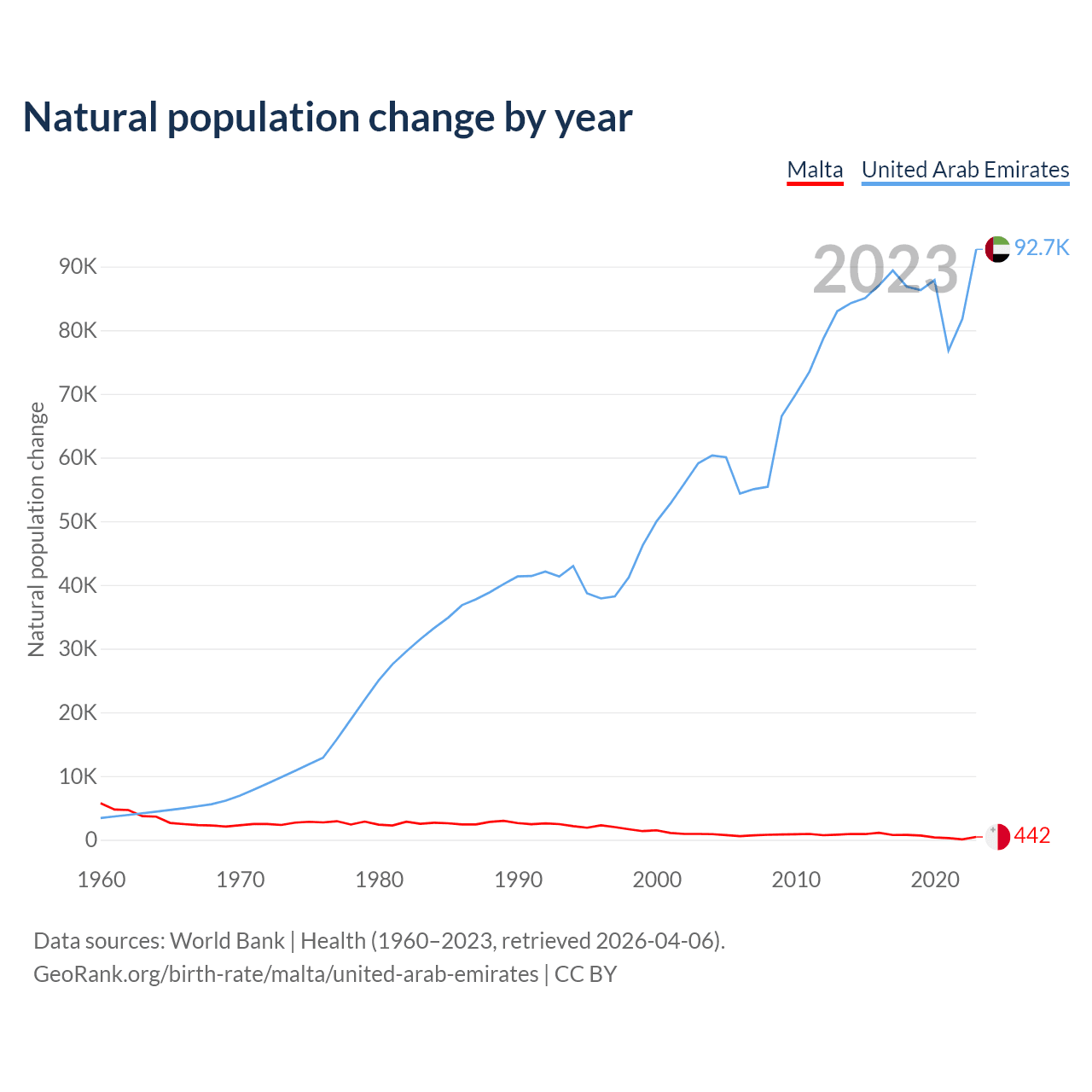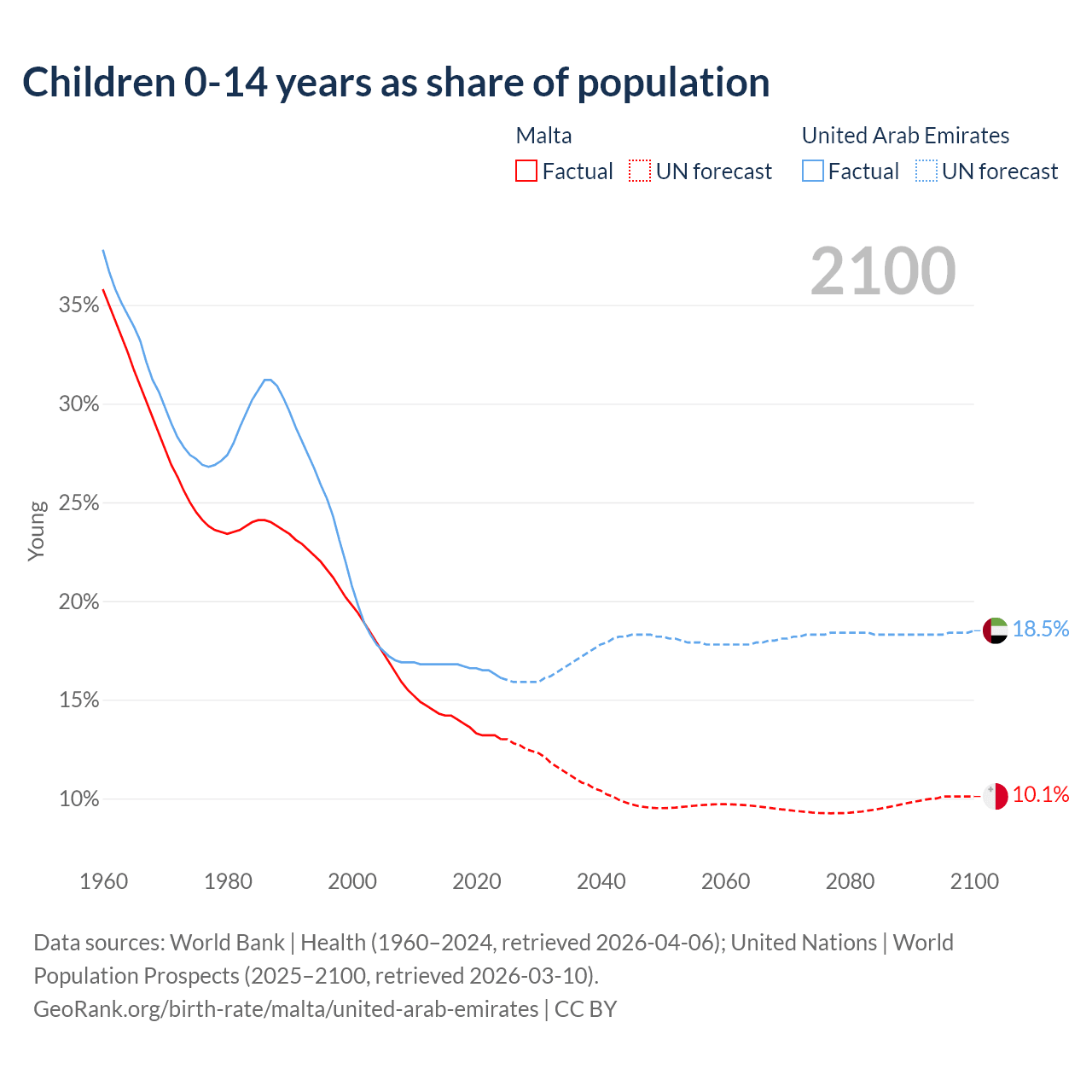 Malta has an annual birth rate of 8.1 births per 1,000 people, compared to 9.77 for the United Arab Emirates. The average number of children a woman is expected to have during her lifetime — the fertility rate, is 1.06 in Malta and 1.2 in the United Arab Emirates — 13.2% difference.