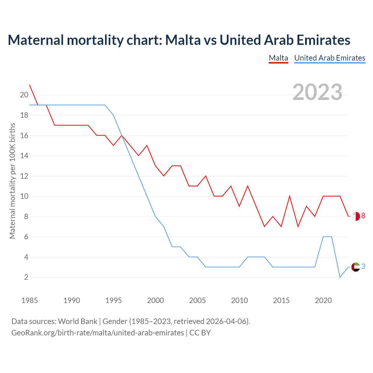 The maternal mortality rate, which is the probability of dying during childbirth or within 42 days of pregnancy termination, is 8 deaths per 100,000 live births in Malta, compared to 3 deaths in the United Arab Emirates.