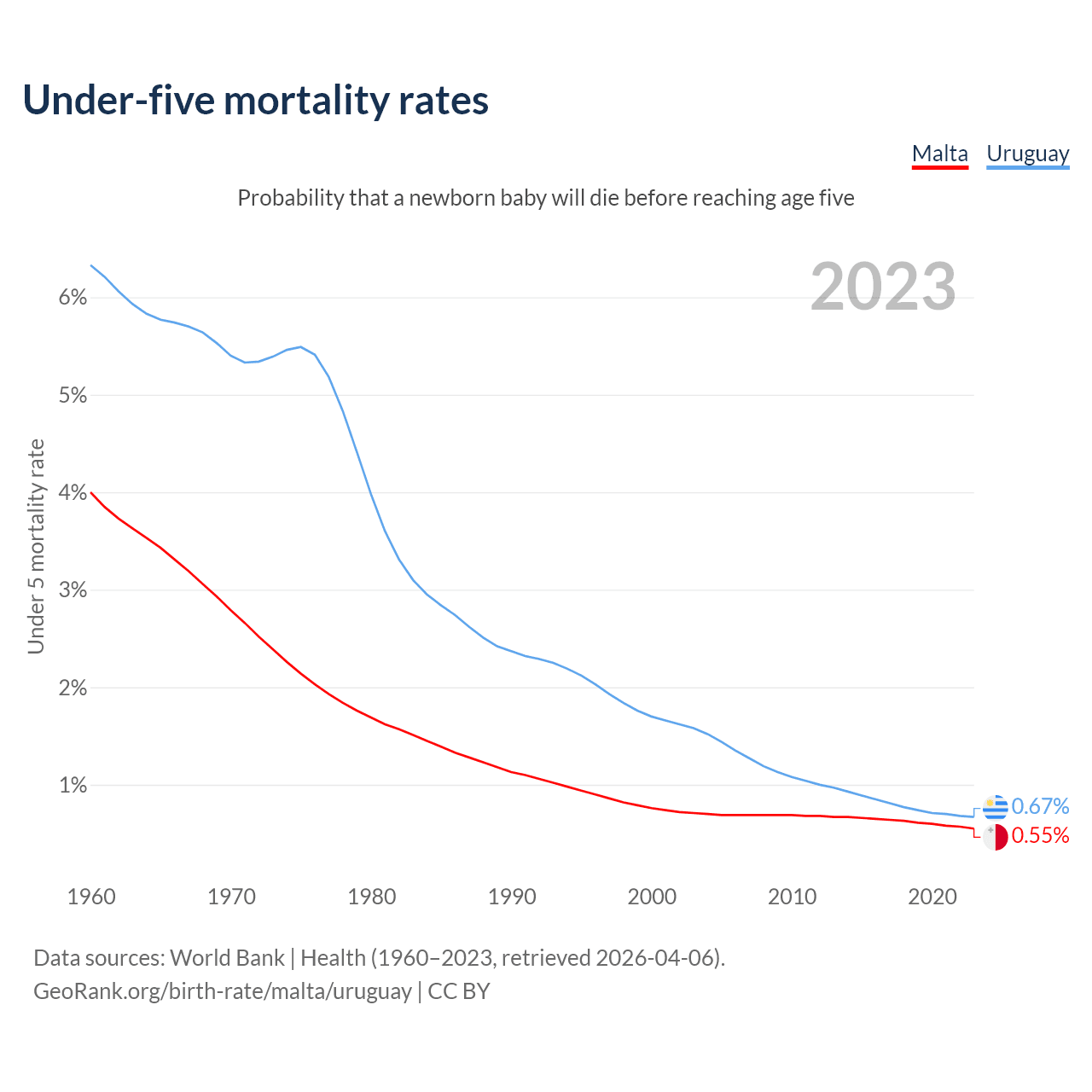 The chance that a newborn baby will die before reaching age five is 0.55% in Malta and 0.67% in Uruguay. Above is a chart with historical data on under-five mortality rates.