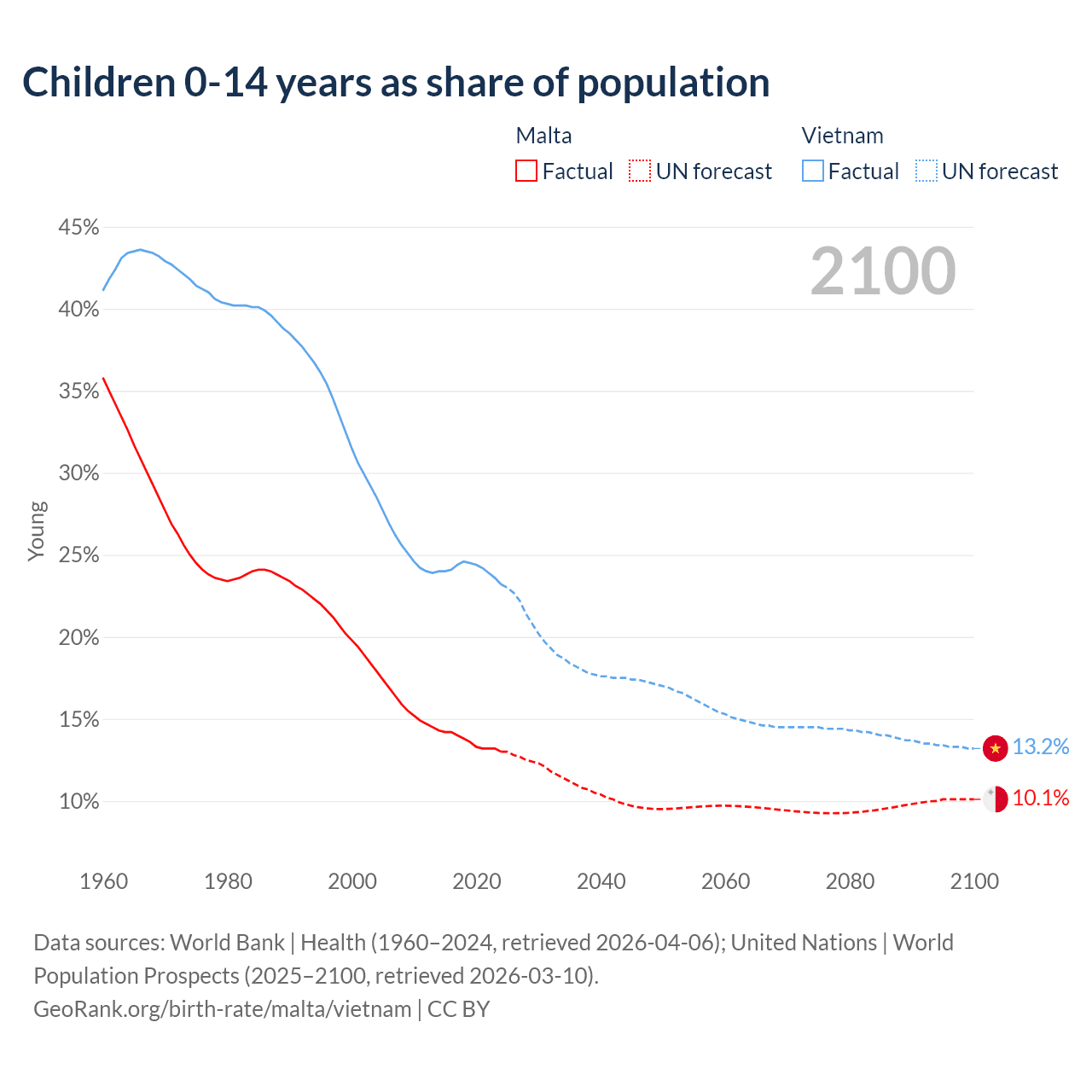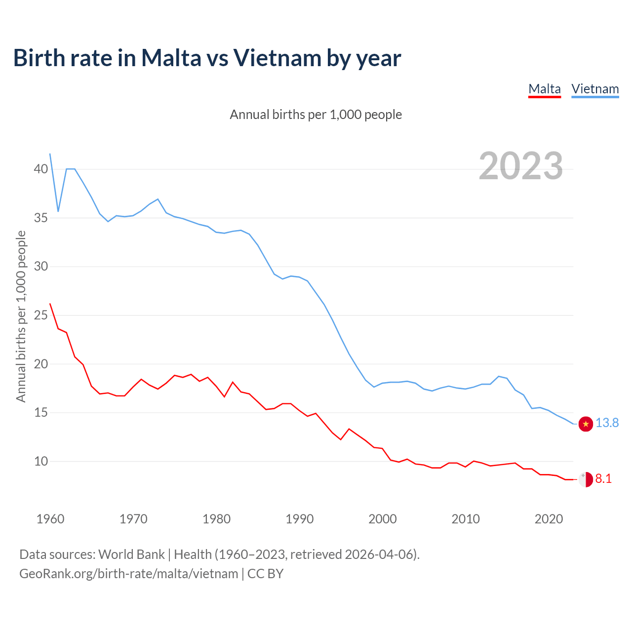 According to the latest available data on birth rates, the fertility rate in Malta was 1.06 children per woman in 2023, compared to 1.91 in Vietnam in 2023. The replacement level is considered to be 2.1 children per woman.