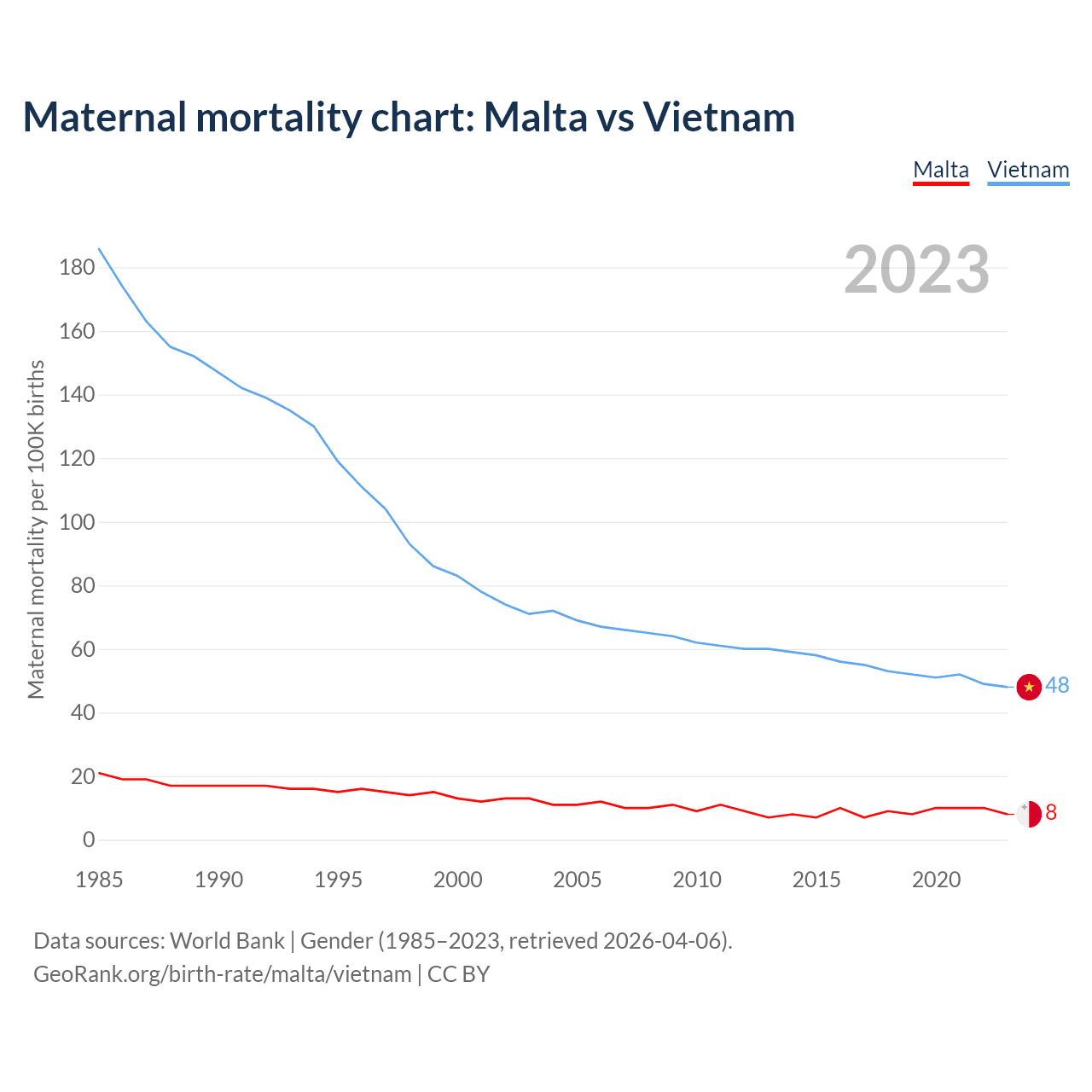 The maternal mortality rate, which is the probability of dying during childbirth or within 42 days of pregnancy termination, is 8 deaths per 100,000 live births in Malta, compared to 48 deaths in Vietnam.