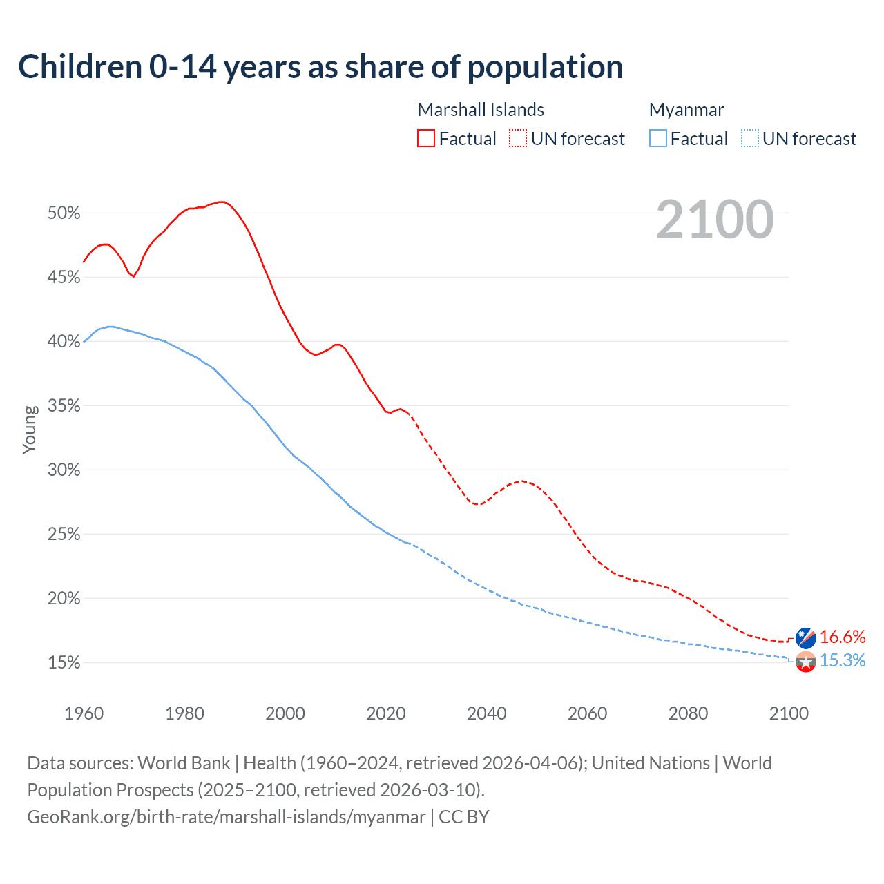 According to the latest available data on birth rates, the fertility rate in the Marshall Islands was 2.92 children per woman in 2023, compared to 2.12 in Myanmar in 2023. The replacement level is considered to be 2.1 children per woman.