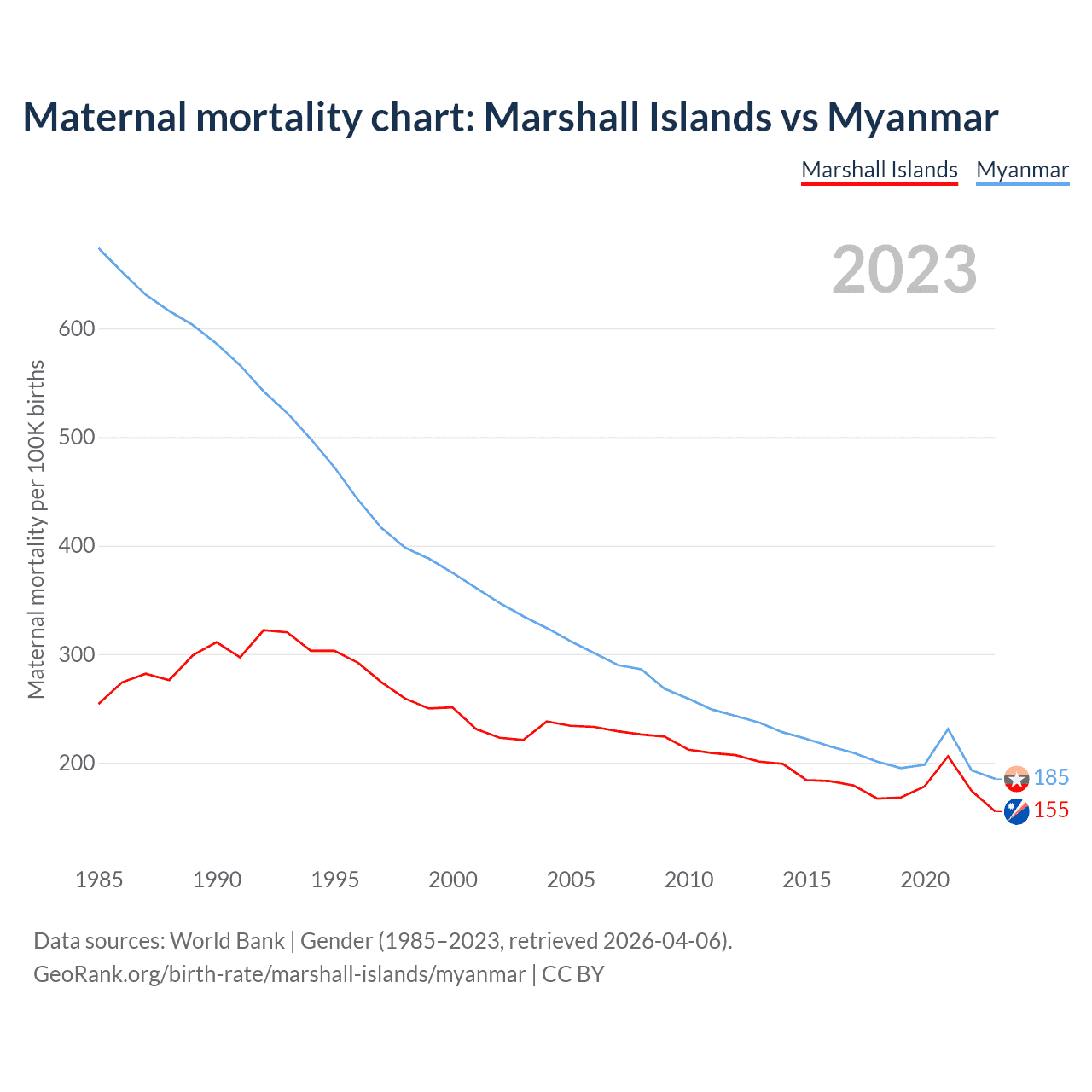 The maternal mortality rate, which is the probability of dying during childbirth or within 42 days of pregnancy termination, is 155 deaths per 100,000 live births in the Marshall Islands, compared to 185 deaths in Myanmar.