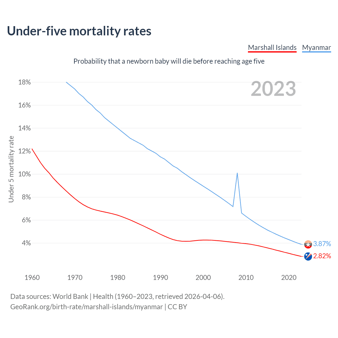 The chance that a newborn baby will die before reaching age five is 2.82% in the Marshall Islands and 3.87% in Myanmar. Above is a chart with historical data on under-five mortality rates.