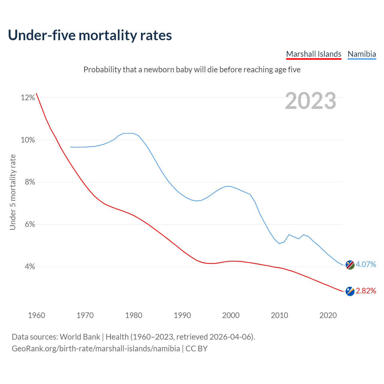 The chance that a newborn baby will die before reaching age five is 2.82% in the Marshall Islands and 4.07% in Namibia. Above is a chart with historical data on under-five mortality rates.