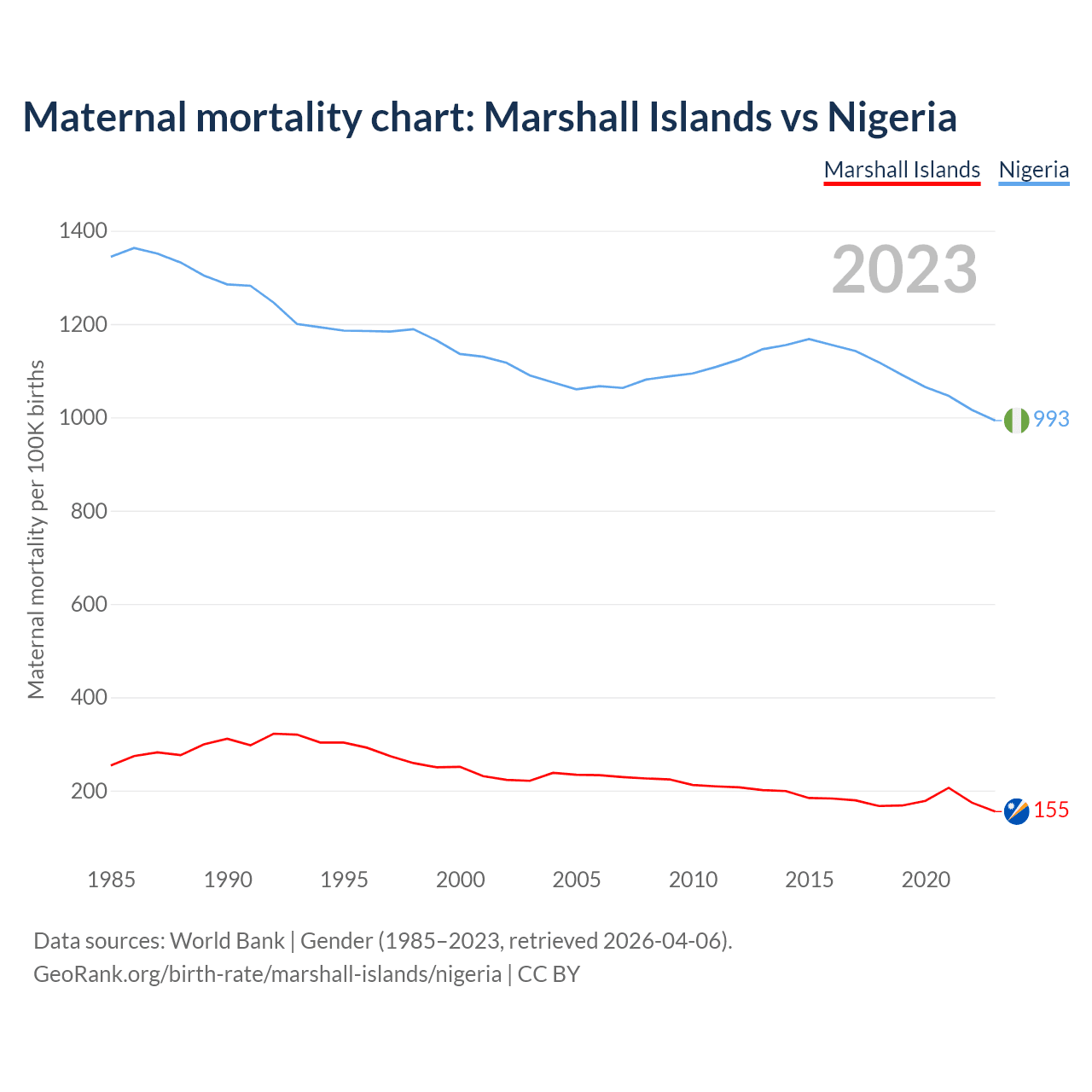 The maternal mortality rate, which is the probability of dying during childbirth or within 42 days of pregnancy termination, is 155 deaths per 100,000 live births in the Marshall Islands, compared to 993 deaths in Nigeria.