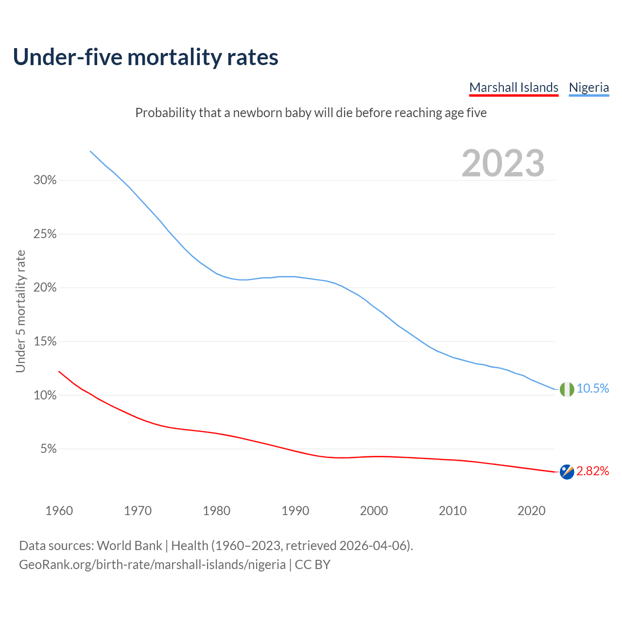 The chance that a newborn baby will die before reaching age five is 2.82% in the Marshall Islands and 10.5% in Nigeria. Above is a chart with historical data on under-five mortality rates.