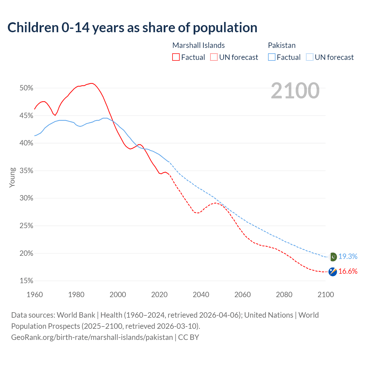 According to the latest available data on birth rates, the fertility rate in the Marshall Islands was 2.92 children per woman in 2023, compared to 3.61 in Pakistan in 2023. The replacement level is considered to be 2.1 children per woman.